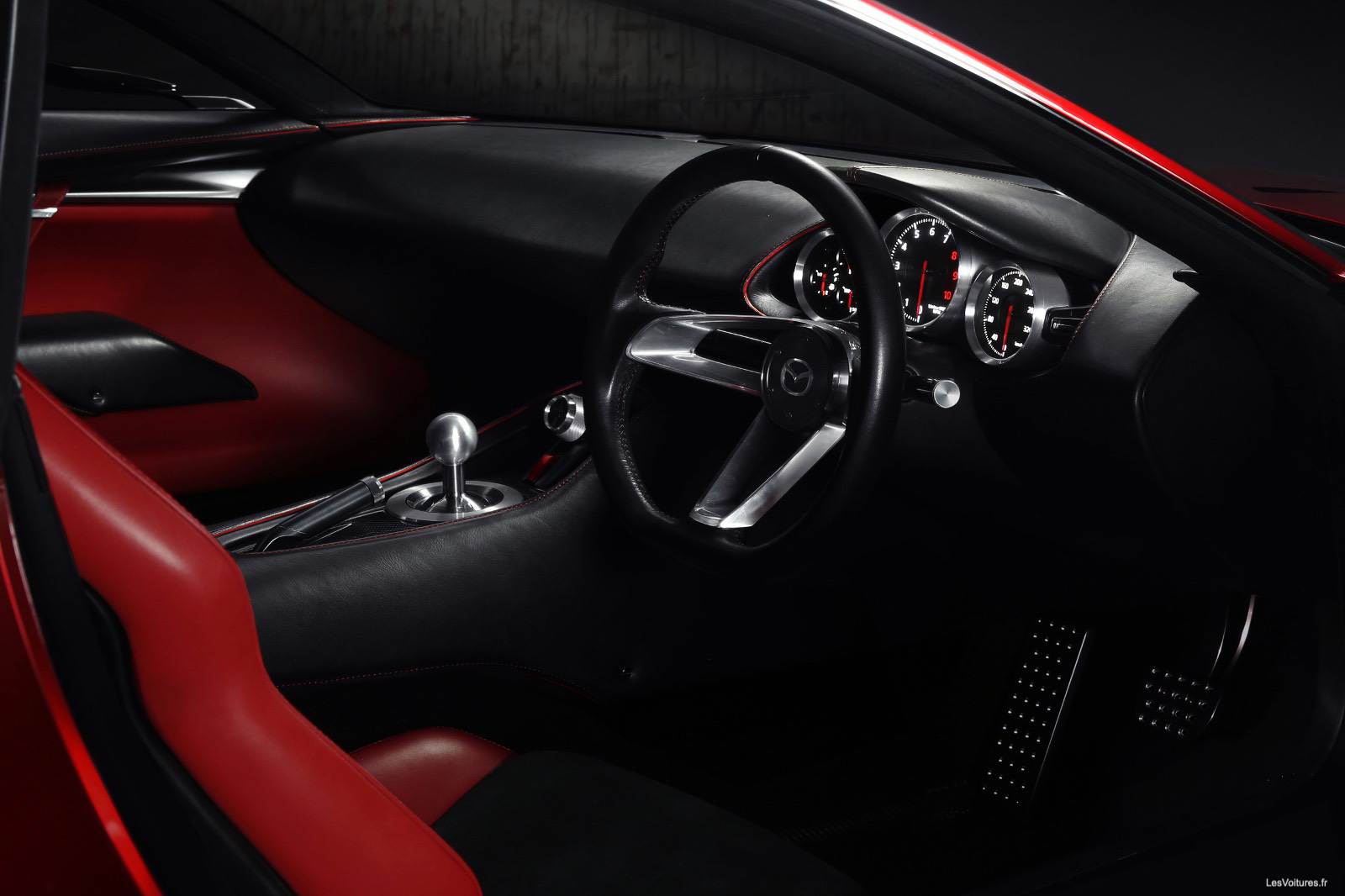 L’intérieur du bolide moderne est tout aussi simple. Il dispose d’un design minimaliste avec un tableau de bord gaîné de cuir, un volant à trois branches et un tableau de bord classique. Maître des « voitures plaisirs » avec la MX-5, Mazda continue dans cet esprit avec un levier de boîte de vitesses et des pédales en alliage léger. La cabine dispose également de garnitures en fibre de carbone.