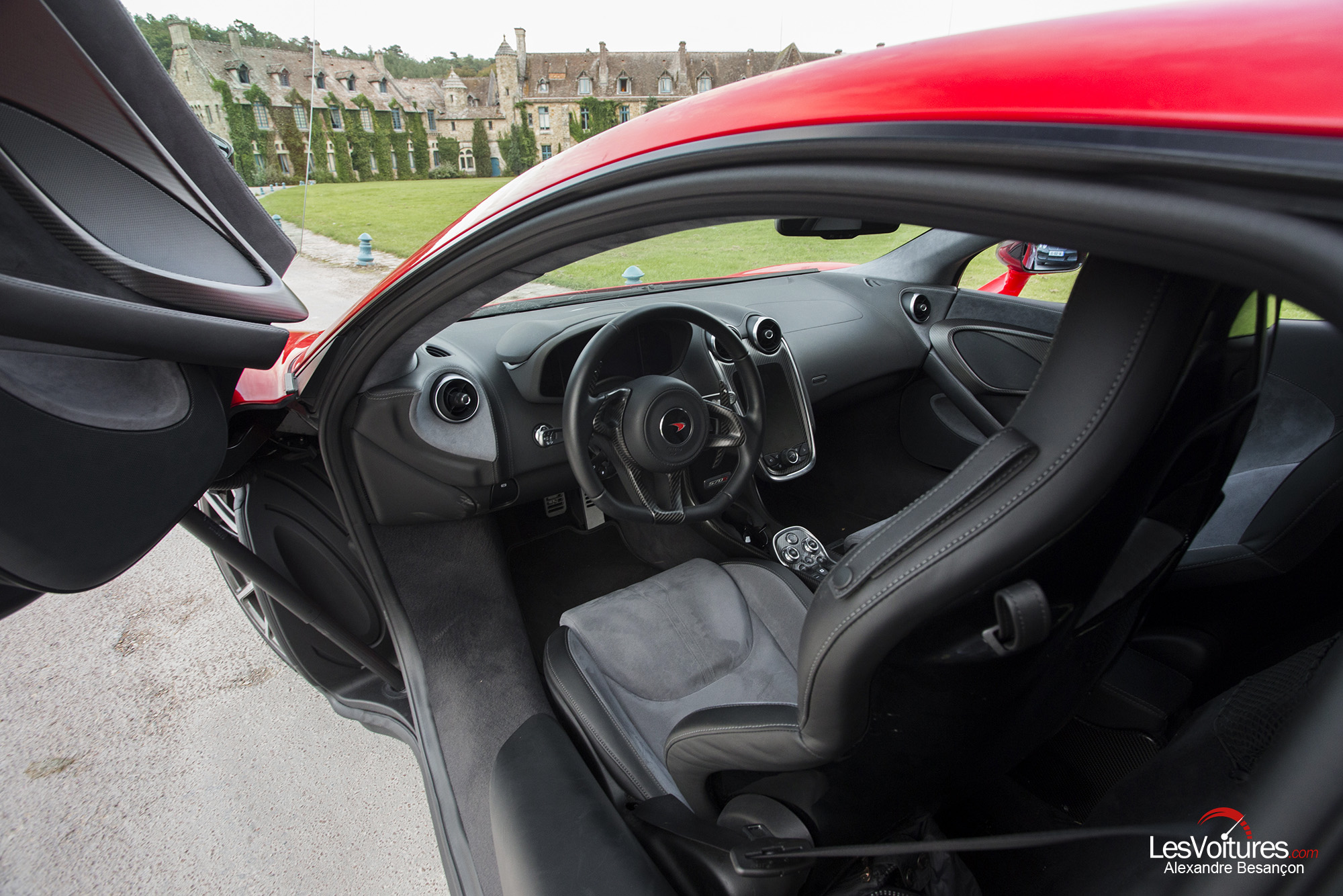 Dès les premiers kilomètres, le sentiment de faire corps avec la voiture est saisissant. Le temps d’adaptation à une conduite en position très basse passe instantanément. Une fois le magnifique site de l’Abbaye des Vaux-de-Cernay dans nos rétroviseurs, la route des 17 tournants nous fait vite comprendre que nous sommes à bord d’une Supercar à l’efficacité redoutable. On freine alors beaucoup trop tôt et on aborde des virages beaucoup trop lentement, la 570S peut en effet faire beaucoup plus, à vous en faire oublier votre conduite de tous les jours. Une fois l’engin appréhendé, on tape fort dans les freins et la Supercar répond parfaitement et surtout en remontant des informations extrêmement claires. Le plus impressionnant, c’est la précision folle du train avant. Bien aidé par une direction assez directe, on est rapidement en osmose totale avec le bolide, une sensation rare qui nous « oblige » immédiatement à jouer avec les boutons de la McLaren : Handling (H) et Powertrain (P). Le N correspondant au mode Normal, les S et T respectivement aux modes Sport et Track.