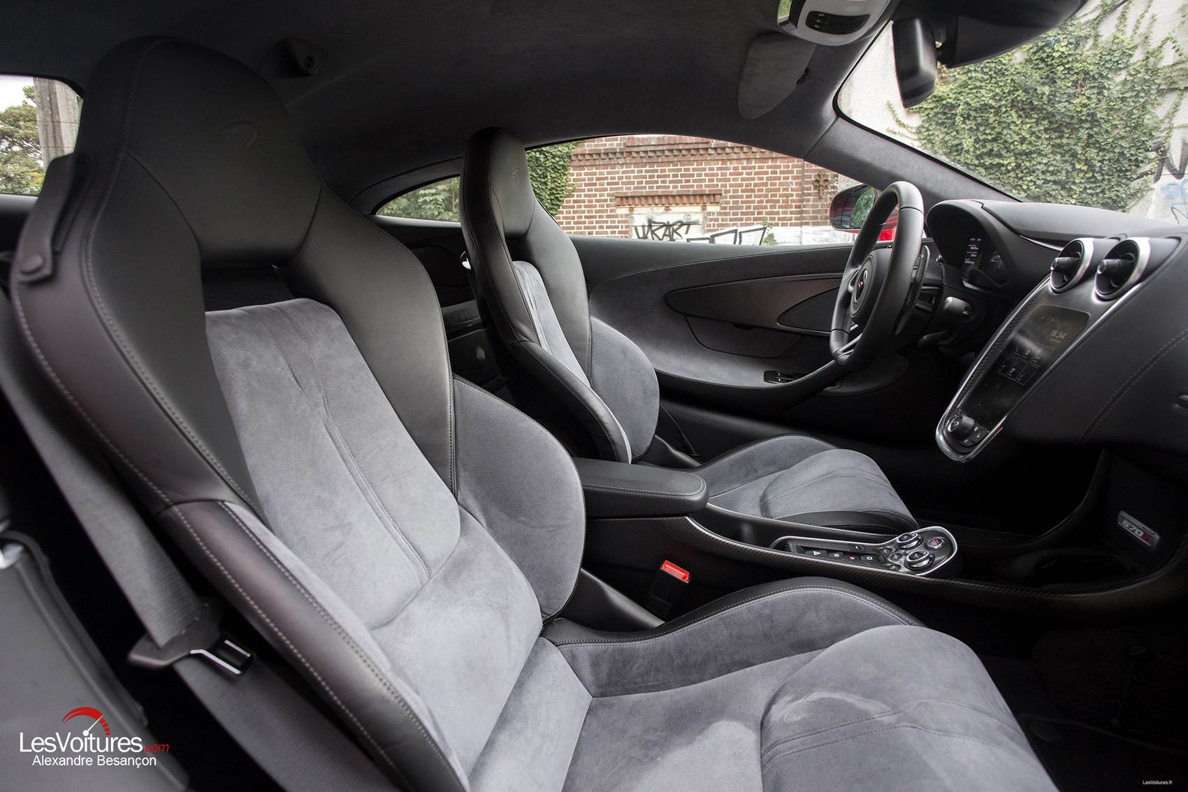 McLaren a répondu aux appels des critiques et autres clients en concevant un intérieur à l’esprit sportif mais qui peut également rester un minium fonctionnel. On entend par cela les quelques rangements disponibles à savoir une boîte à gants et des espaces situés dans les portières. Ceux qui en souhaiteraient davantage pourront se diriger vers la 570GT (à retrouver très prochainement à l’essai). Et si on continue la comparaison avec la 650S, la console centrale en un bloc de cette dernière n’a pas été reprise sur la 570S.