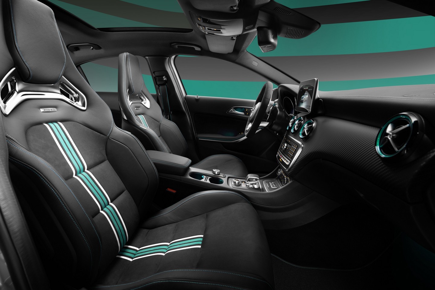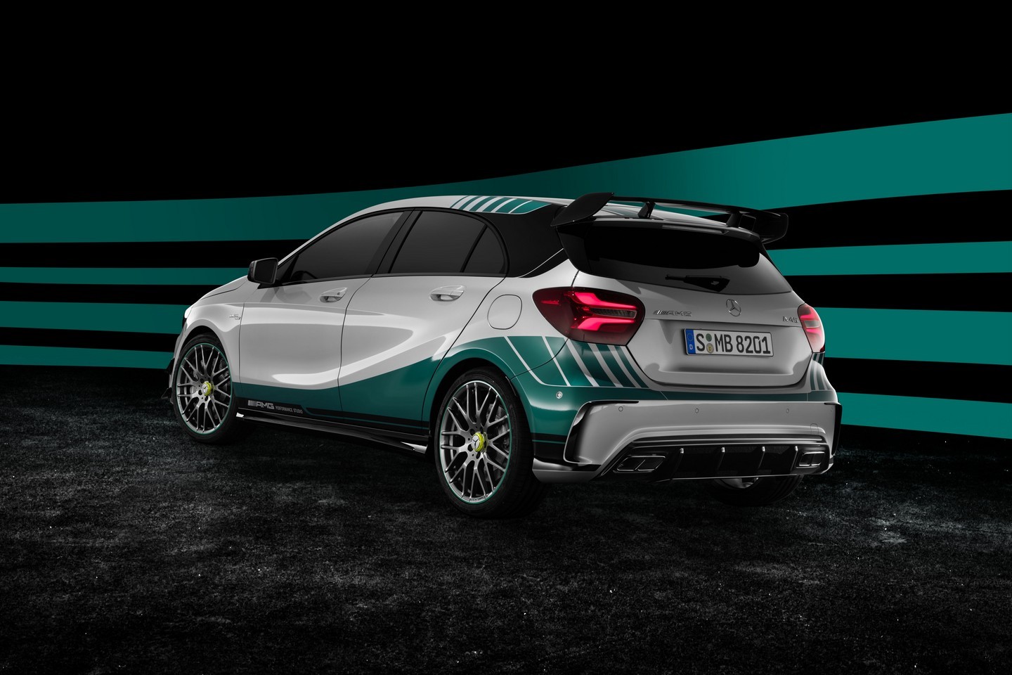 Cette A45 reprend les couleurs des monoplaces W06 Hybrid et se dote de nombreux éléments aérodynamiques qui la transforment en bête de course. L’intérieur de l’auto reprend la même philosophie F1.
