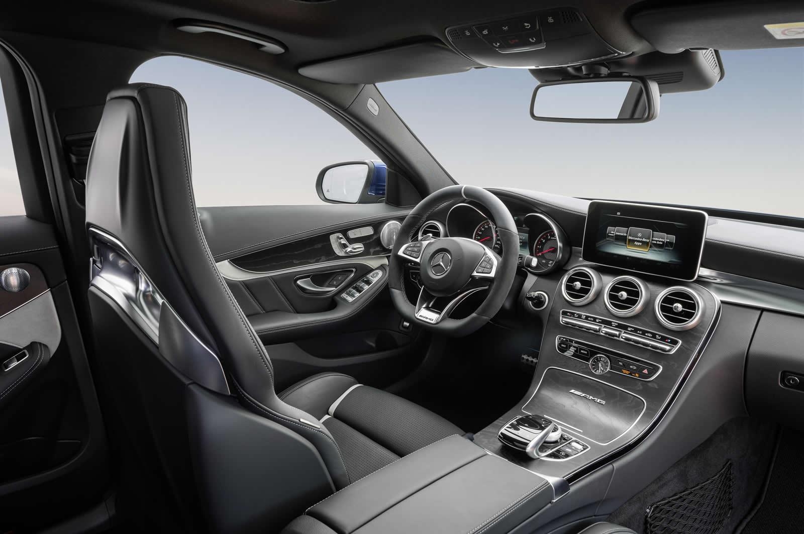 Des jantes spécifiques de 18″ pour la C63 et 19″ pour la C63 S, et un spoiler sur le coffre arrière, viennent parachever la transformation. L’intérieur reprend les codes de Mercedes-AMG : un large volant de cuir, des sièges baquet surpiqués de rouge ainsi que des inserts carbone omniprésents façonnent un cockpit digne d’un chasseur supersonique.