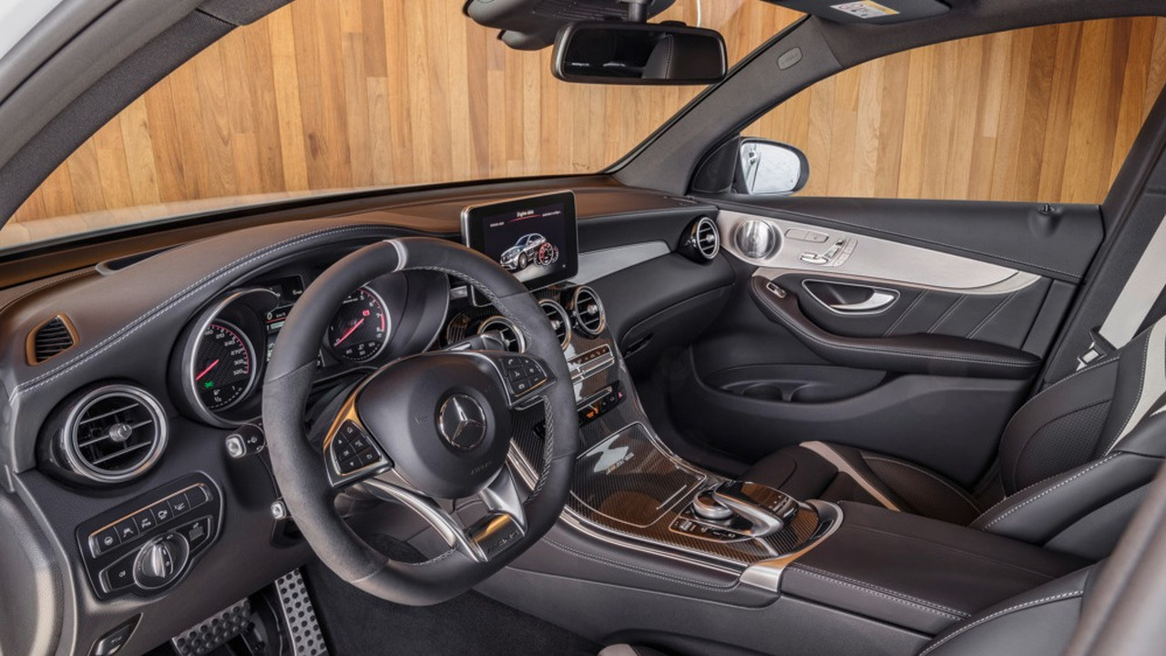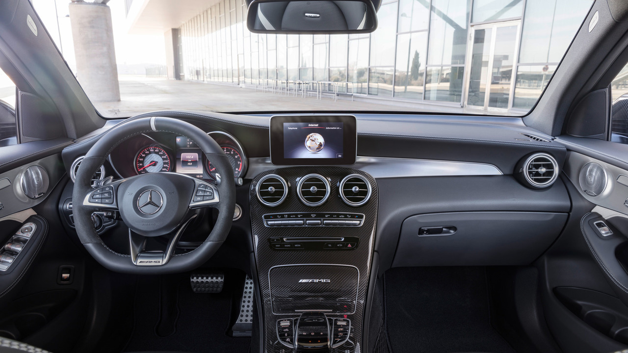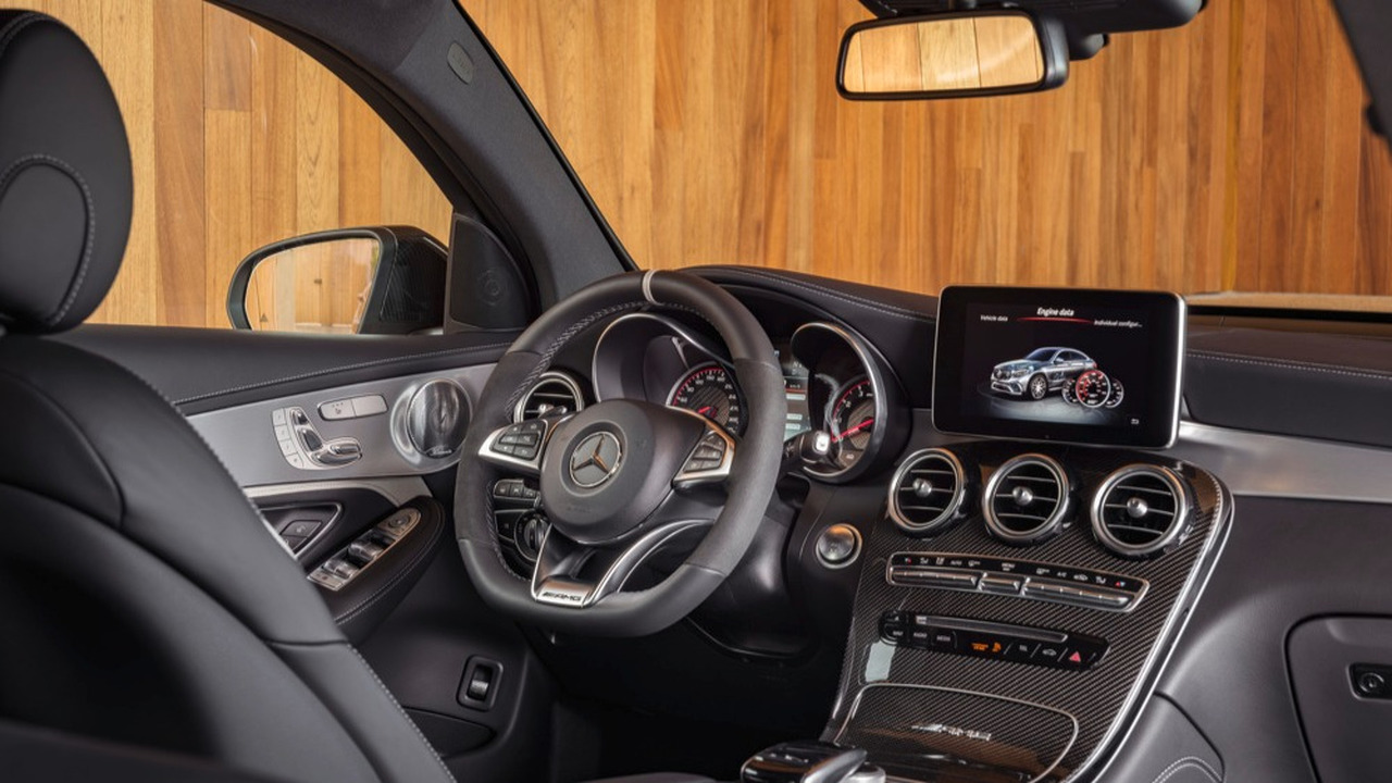 A l’intérieur, la fibre de carbone est omniprésente. Plus qu’un habitacle, on est en présence d’un cockpit ultra-sportif toujours aussi sérieusement fini. Les technologies et autres aides à la conduite sont aussi une priorité chez Mercedes-AMG. Ainsi, le DYNAMIC SELECT, un standard du segment, propose les modes de conduite Confort, Sport, Sport+ et Individuel. Les GLC 63 S et S Coupé offrent un mode supplémentaire : Race. Ces versions les plus puissantes disposent en complément d’un différentiel électronique à glissement limité qui est situé sur l’essieu arrière.