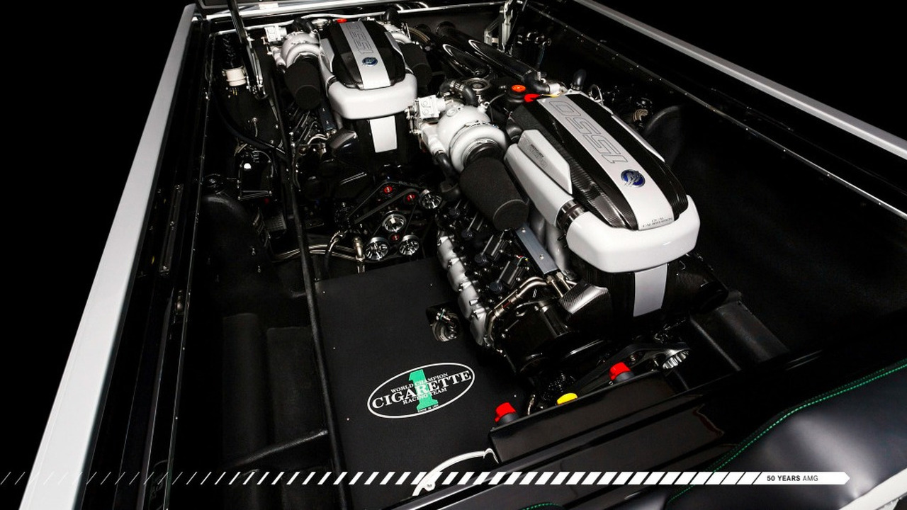 Pour fêter les 50 ans d’AMG, la structure Cigarette Racing s’est donc inspiré de la Supercar allemande pour développer cet engin maritime qui développe 1 350 ch par moteur Mercury . Si cela n’est pas suffisant, 1 550 chevaux peuvent être atteints à l’aide d’une clé de « débridage ». Au total, plus de 3 000 ch sont envoyés sur les flots !