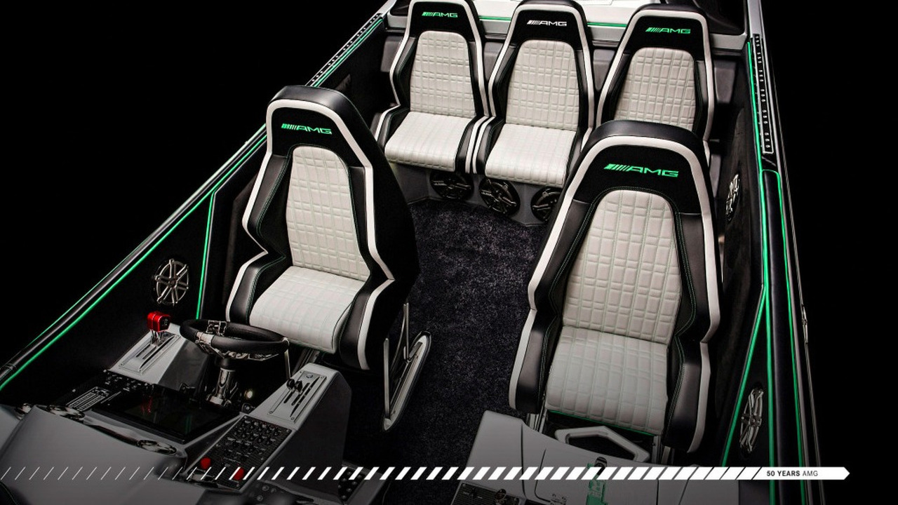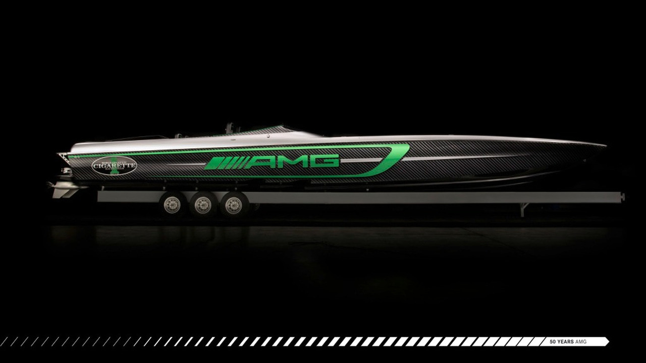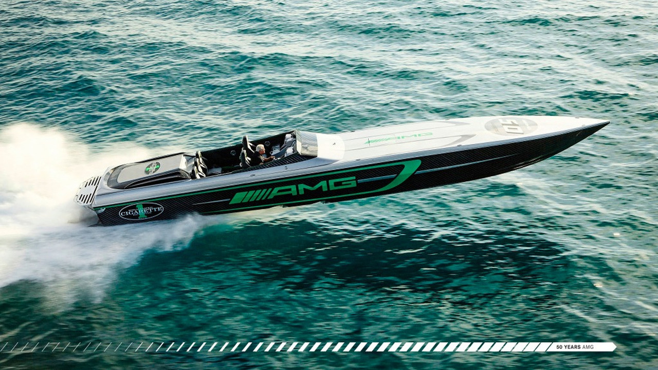 Pour fêter les 50 ans d’AMG, la structure Cigarette Racing s’est donc inspiré de la Supercar allemande pour développer cet engin maritime qui développe 1 350 ch par moteur Mercury . Si cela n’est pas suffisant, 1 550 chevaux peuvent être atteints à l’aide d’une clé de « débridage ». Au total, plus de 3 000 ch sont envoyés sur les flots !