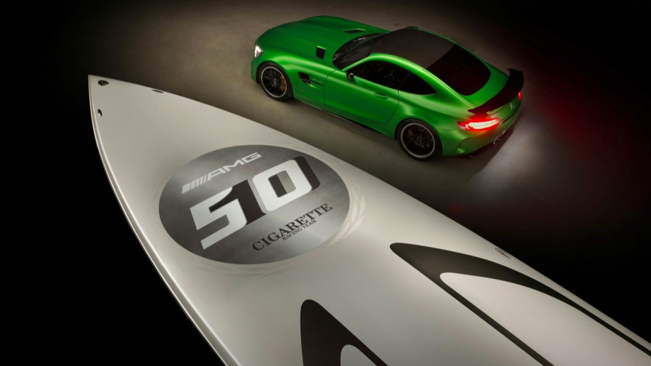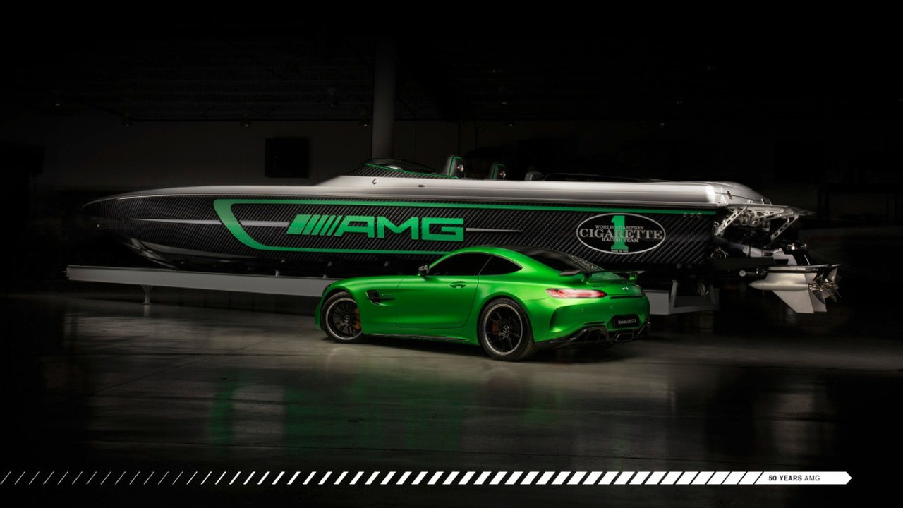 Les spécialistes des hors-bords ont présenté le 50 Marauder dans le cadre du Miami International Boat Show. Il reprend la teinte Green Hell Magno AMG de la Supercar. La fibre de carbone, qui compose la structure du bateau, marque également les similitudes avec la Mercedes-AMG GT R. Ainsi ce ne sont pas moins de 600 kilos qui ont été gagnés.