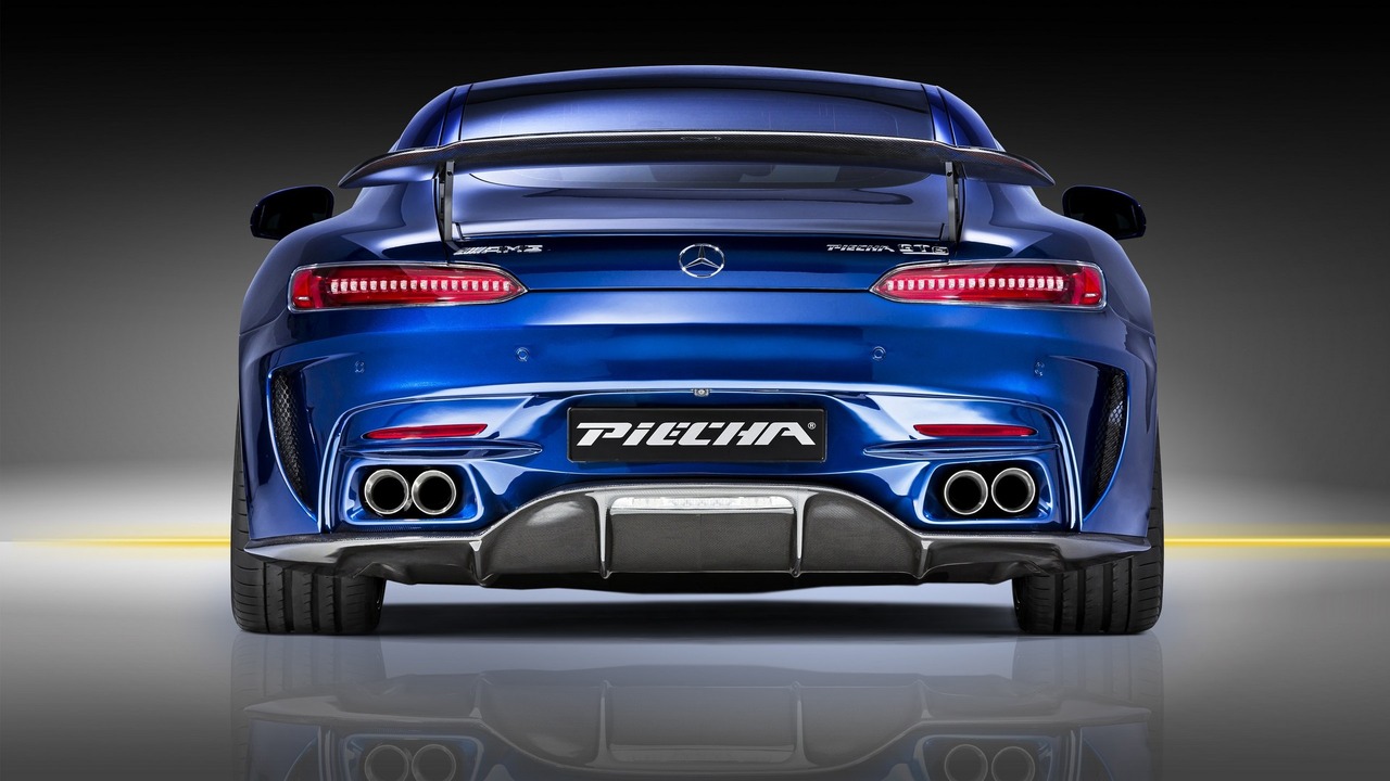 L’arrière de la de la Mercedes-AMG GT-RSR « by Piecha » est quant à lui très différent de la version d’origine. Aileron fixe imposant, diffuseur tout aussi impressionnant et une quadruple sortie d’échappement sont au programme.