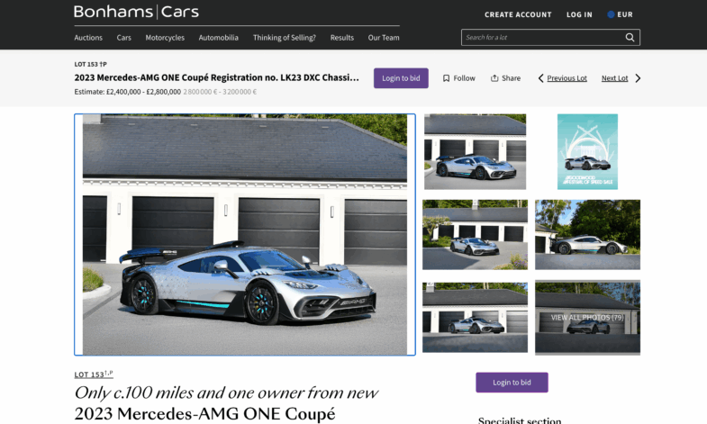 Produite à seulement 275 exemplaires dans le monde, la Mercedes-AMG One est déjà un objet de convoitise pour les collectionneurs. L’exemplaire qui sera mis en vente à Goodwood, avec son faible kilométrage, son historique limpide et ses nombreuses options, représente une opportunité rare sur le marché. Pour tout savoir sur cette AMG One et en découvrir de très nombreuses autres photos, nous vous invitons à cliquer sur l’image située ci-dessous pour accéder directement au site internet Bonhams Cars.