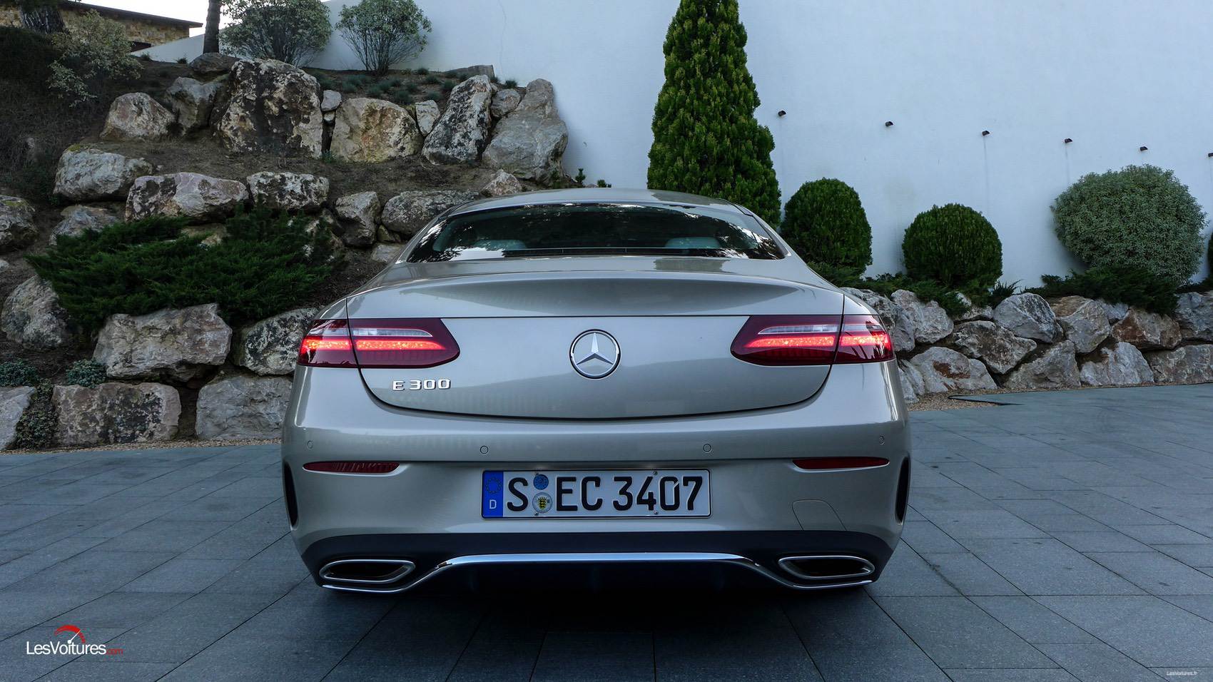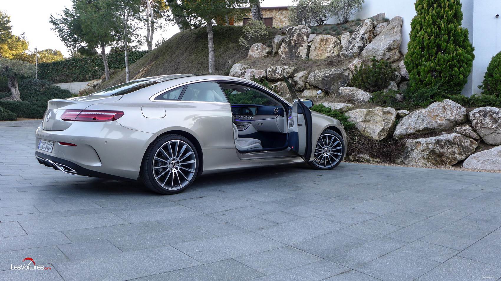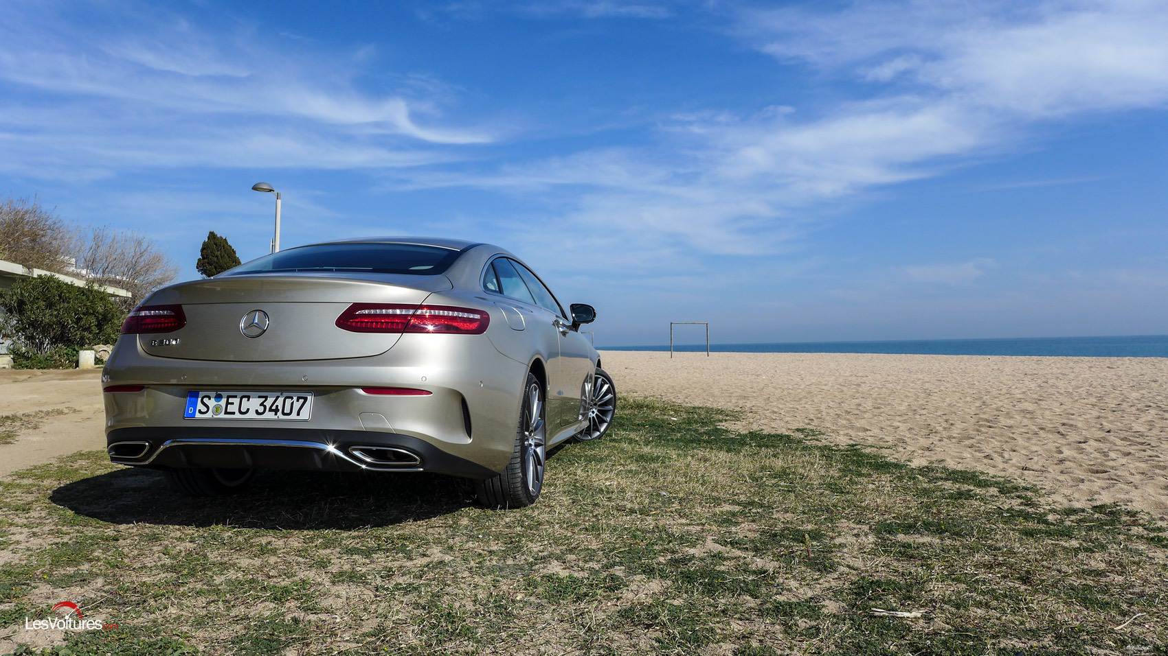 A l’arrière, ou de ¾ arrière, le spectacle est grandiose. Après la Classe C Coupé qui nous avait charmés (essai ici), sa grande sœur nous refait le coup. Rouler derrière une Classe E Coupé, c’est rencontrer la perfection d’un design équilibré, à la fois imposant et sportif. Les longs feux subliment l’ensemble qui est soigneusement relevé par des touches de chrome situées sur les canules d’ échappement et le diffuseur. Finissons par la touche « Champagne » qui va comme un gant au coupé à l’étoile. Baptisée Argent aragonite, elle génère une sensation visuelle unique, tel un nouveau luxe automobile.