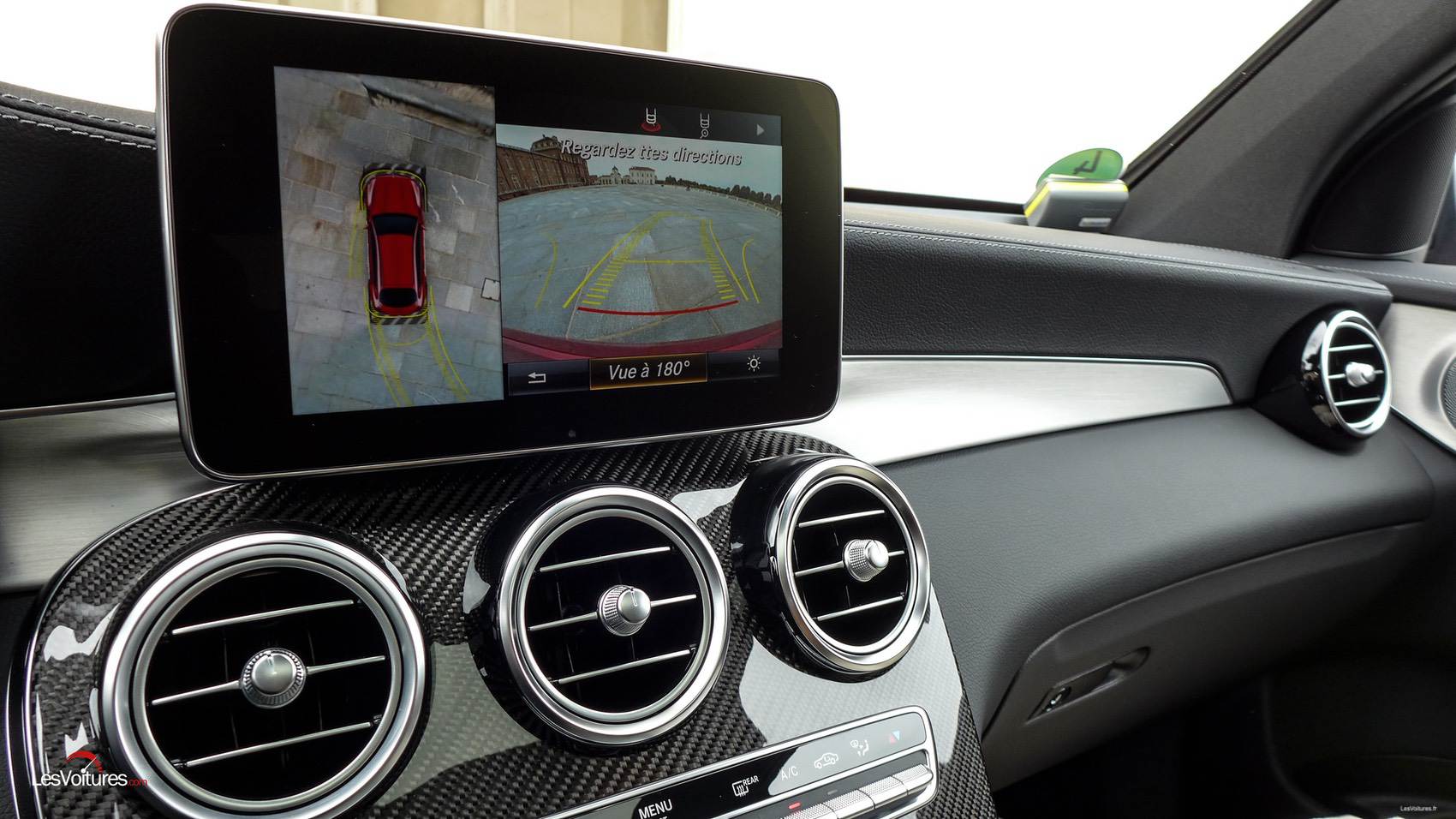 Avant de mettre le contact, visitons, car c’est bien le verbe à employer, le superbe habitacle du GLC Coupé. C’est une véritable plongée dans l’univers AMG qui nous est proposée ! Pour jouir de cette ambiance hyper-sportive, il faudra opter sans supplément pour la sellerie rouge et noire en cuir ARTICO et s’offrir les inserts AMG, un mix de carbone et aluminium (1 100 €). Comme à son habitude, le constructeur allemand a soigné dans les moindres détails les finitions de sa création et l’ergonomie de conduite ne souffre d’aucun défaut. Allez, nous allons quand même critiquer cet écran « posé » sur le haut de la console centrale. On aurait apprécié une plus belle intégration mais son utilisation tactile et son pad de commande de même technologie nous font vite oublier ce détail. Il est temps de mettre les mains sur un volant parfaitement étudié. Il permet en de simples clics d’avoir accès à toutes les fonctionnalités du véhicule.