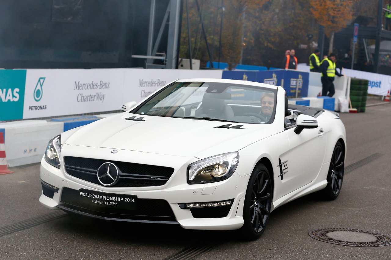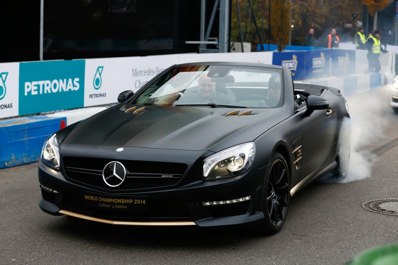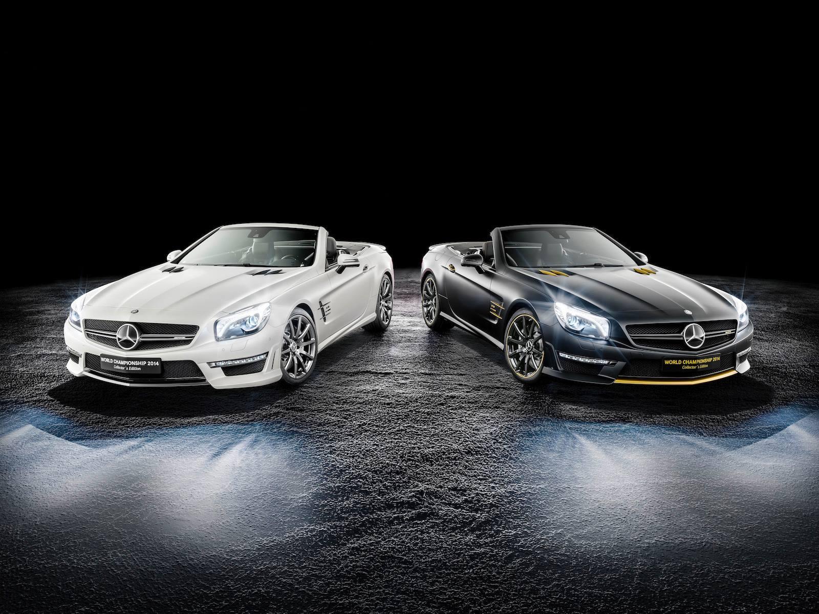 Baptisée « Mercedes-Benz SL 63 AMG World Championship 2014 Collector’s Edition », cette édition très spéciale, disponible en noire ou en blanche du roadster à l’étoile, ravira les collectionneurs. Lewis Hamilton s’est personnellement chargé des évolutions esthétiques apportées à la SL 63 AMG « black » et dorée tandis que Nico Rosberg s’est concentré sur la « white » chromée.