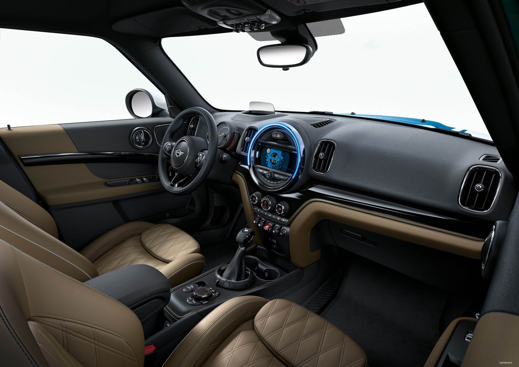 A l’avant, on remarque immédiatement les nouveaux feux qui accompagnent un bouclier et une calandre complètement redessinés. Les flancs de cette MINI font ressortir une ligne de toit qui chute en rupture avec une custode arrière beaucoup plus grande. L’arrière est comme l’avant très chargé surtout que le modèle présenté arbore le kit extérieur ALL4 Line.