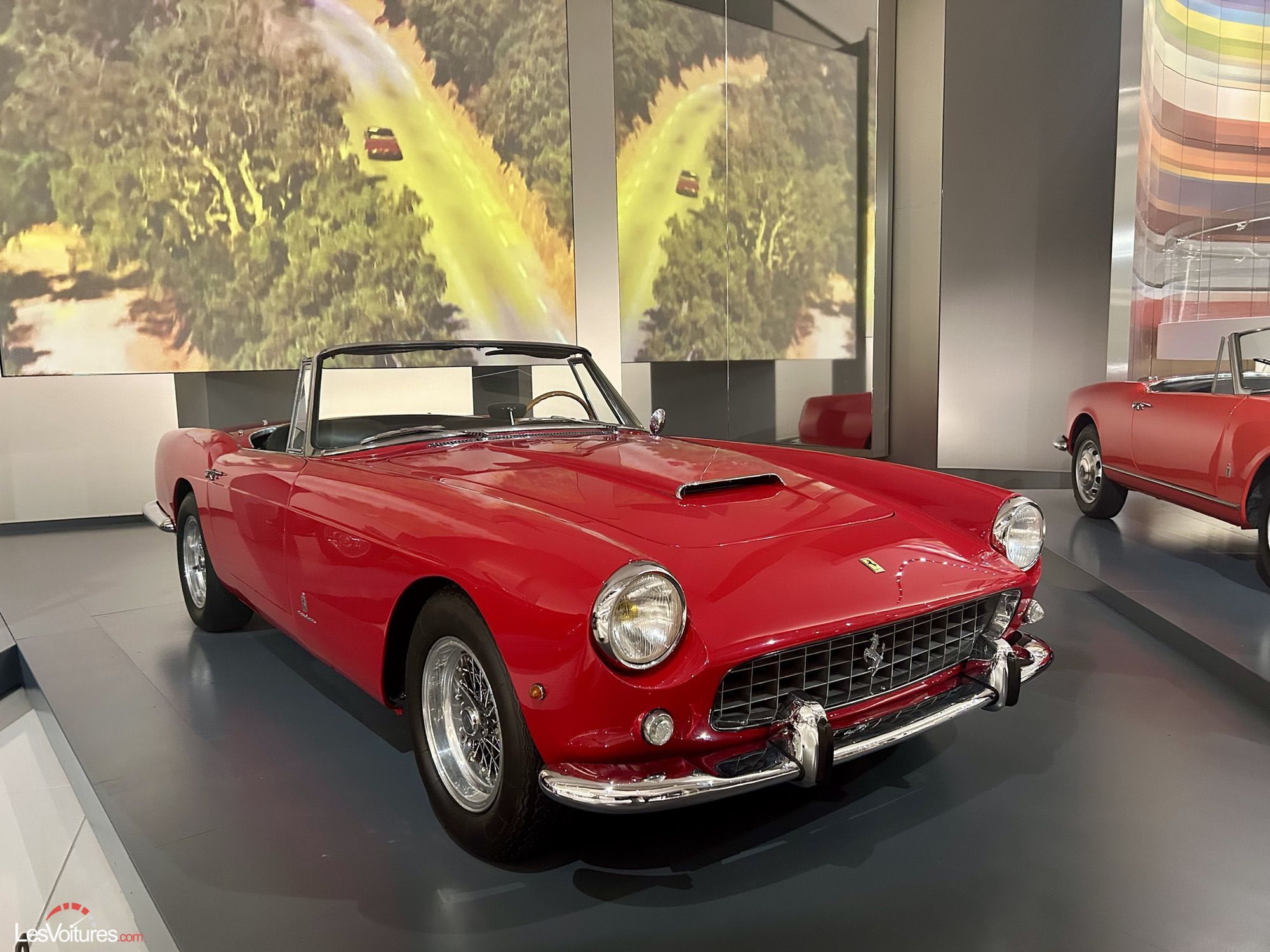 Non loin, une Ferrari 250 GT Cabriolet Série II, incarnation du glamour des années 1960, équipée du mythique V12 Colombo de 240 ch capable d’atteindre 240 km/h. Son rouge profond, presque cérémoniel, a largement contribué à bâtir la légende de Ferrari.