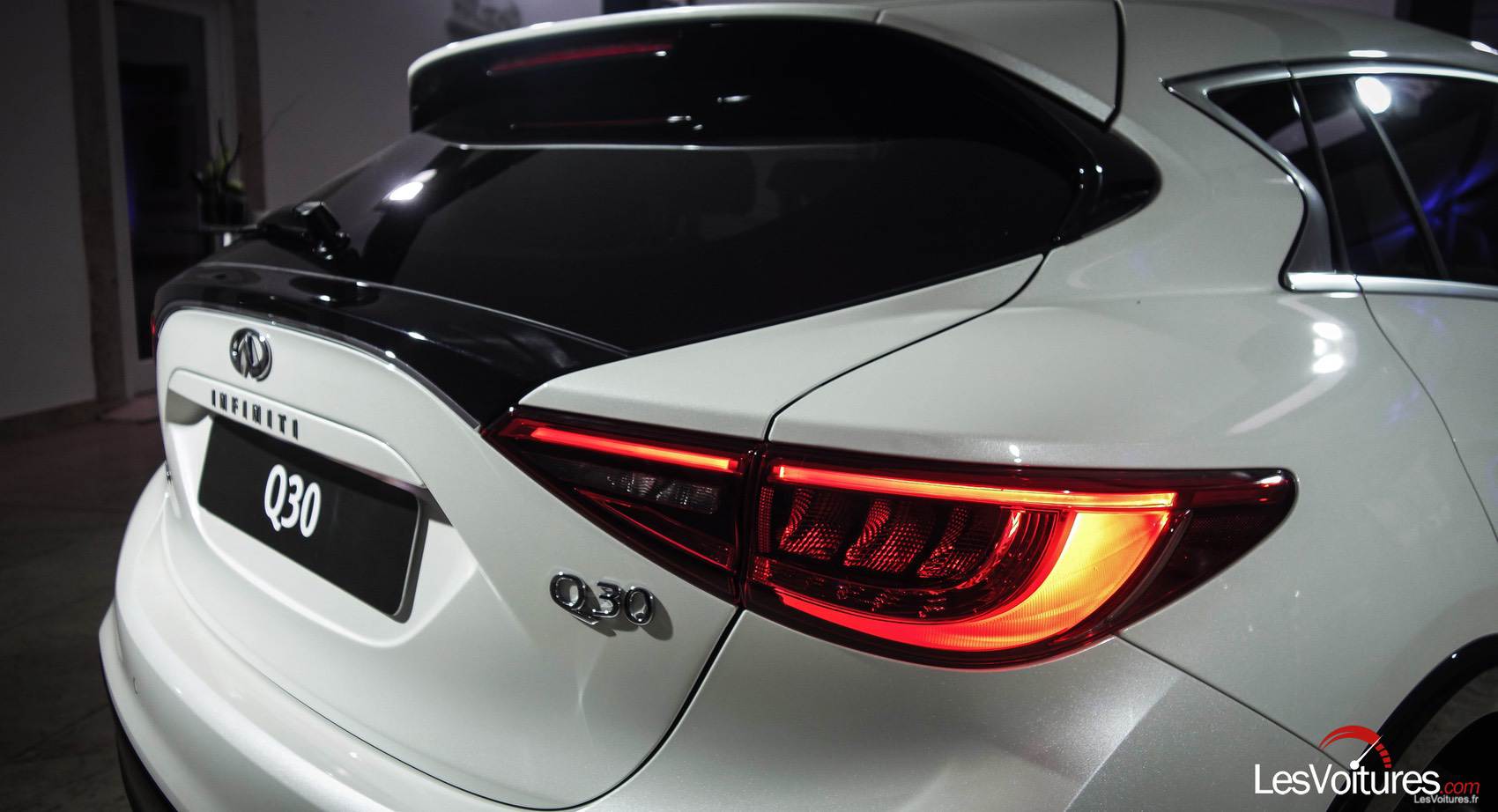 Les flancs de la berline premium se jouent des standards visuels du Segment C et proposent un design fluide. Les lignes des vitres latérales arrière ont été effilées à leur maximum et terminent leur course dynamique vers une cassure. Cela permet aux galbes de l’arrière de la Q30 de ressortir joliment et d’offrir un aspect visuel des plus robuste. Encore plus original que l’avant, le bouclier arrière, surélevé et accompagné d’un diffuseur qui intègre une double sortie d’échappement, assoit l’esthétique innovante de la Q30.