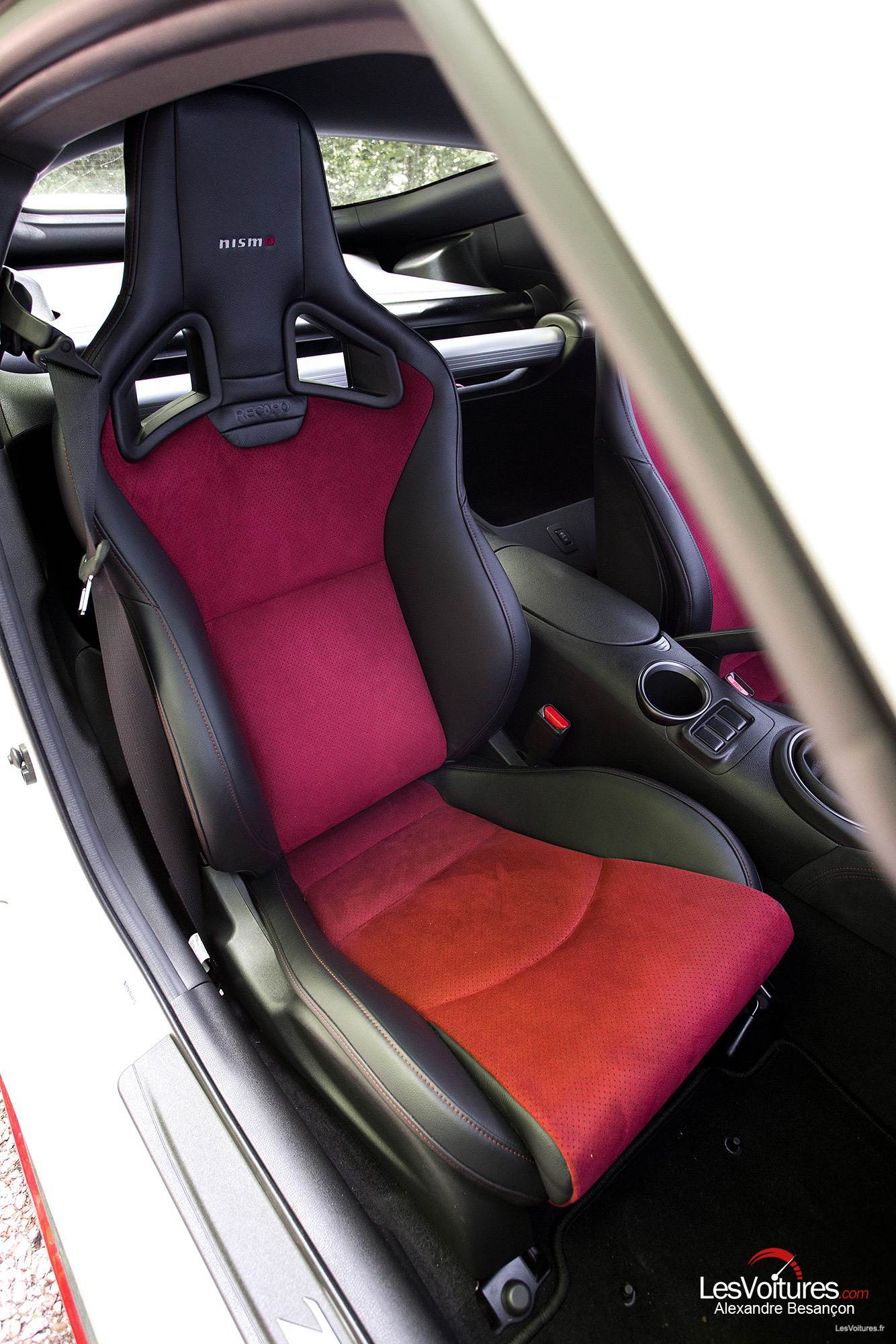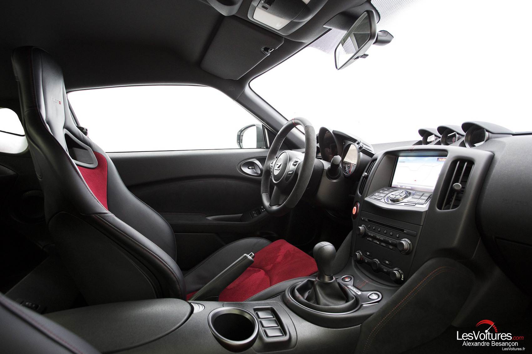 Strict deux places, l’intérieur du 370Z NISMO est simple, et encore une fois, ce sont les sièges baquets Recaro en cuir Alcantara rouge et noir qui étonnent. Le modèle qui trône en haut du catalogue 370Z profite d’un volant gainé de la même matière noble que les sièges et de cadrans d’instrumentation exclusifs. Sans oublier en série, la caméra de recul et le « NISSAN Connect Premium », système multimédia et de navigation haut de gamme. Hélas, le gros point noir est à mettre à l’actif de l’ergonomie de ses commandes, obsolètes, pas du tout intuitives. Bref, il y a beaucoup trop de touches sous l’écran de 7″.