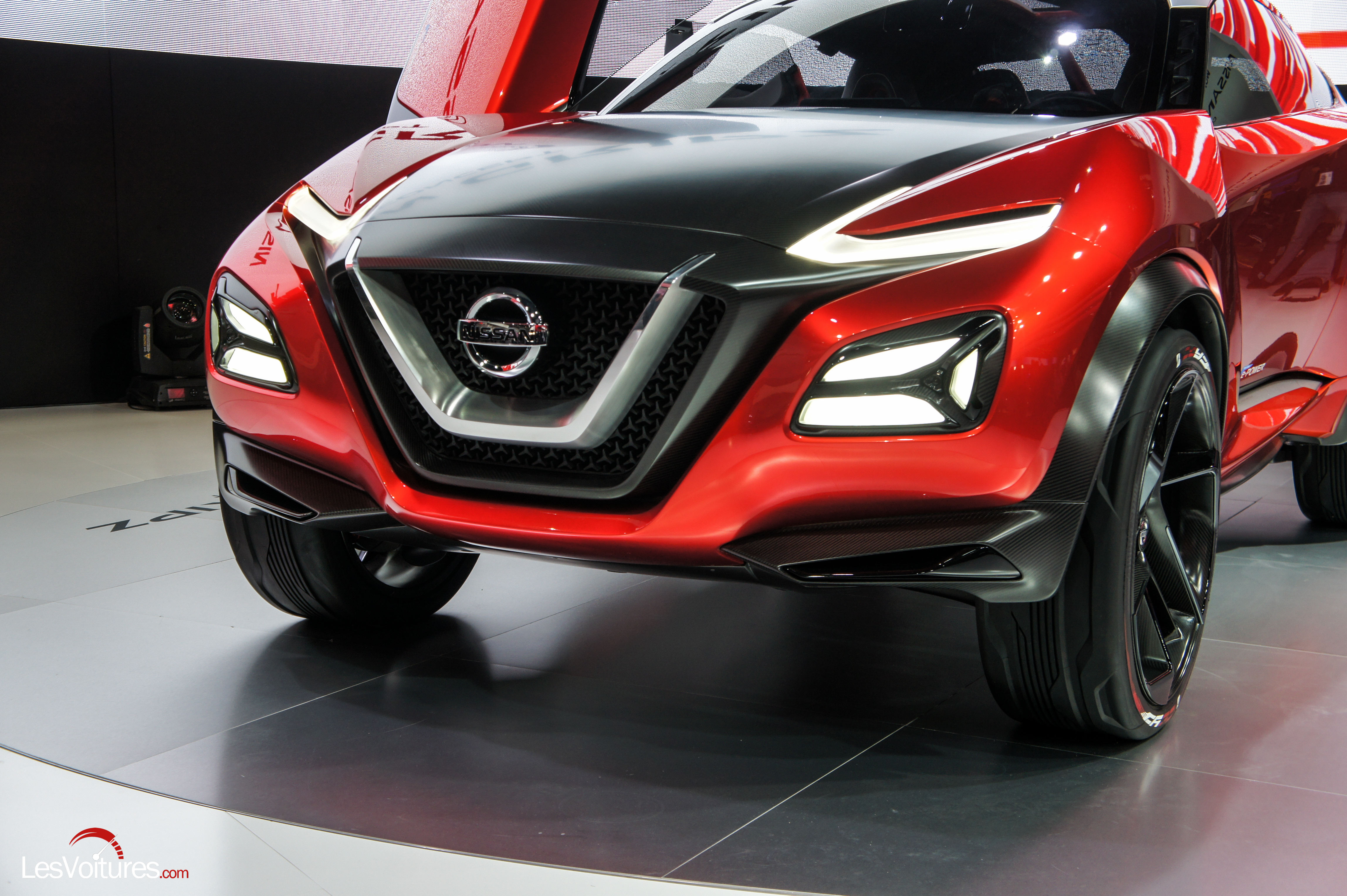 Cette belle étude de style reprend le format du Juke avec 4,10 m de longueur. L’avant du Gripz Concept fait encore grandir le logo Nissan et l’élément métallique qui l’entoure gagne aussi en taille. Ce concept-car qui semble avoir été dessiné à coups de serpe nous rappelle bien sûr la 370Z de par ses projecteurs avant. Quant aux jantes, elles sont de 22″, non cela n’existera pas en série.
