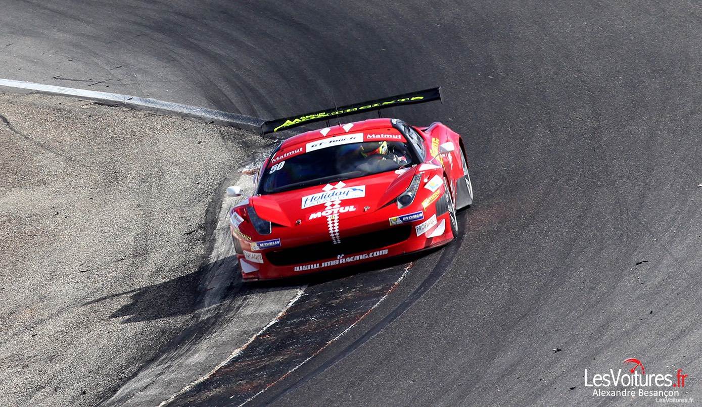 Après nos tours de piste qui nous offrent des visuels uniques au monde, Nicolas Misslin nous rappelle les grandes dates du JMB Racing : « JMB Racing a été créé en Décembre 1994 et a remporté à ce jour 19 titres internationaux. Parmi ces trophées on trouve trois Coupes du Monde des Sports Prototypes en 1998, 1999 et 2000 avec une Ferrari 333 SP et un titre de Champion du Monde Pilotes et Equipes N-GT FIA 2001 avec une Ferrari 360 Modena N-GT. En 2011, le team remporta le championnat d’Europe GT OPEN pilote et Team avec une Ferrari 458 GT2. En 2012 le titre de vice-champion European Le Mans Series (ELMS) avec une Ferrari 458 GT2. 2013 est marquée par l’entrée en piste de la Nissan GT-R Nismo GT3 engagée au Championnat de France GT ainsi que d’une Ferrari F458 Italia GT3 engagée en Coupe de France GT FFSA.» Ci-dessous, la Ferrari du JMB Racing en piste à Lédenon, avec à son bord notre ami Jérôme Demay.