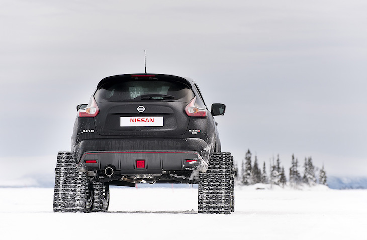 Le Nissan Juke Nismo RSnow a été préparé par American Track Truck qui lui a greffé le système « Dominator Track System » à la place des roues. Le résultat est aussi délirant qu’efficace sur la neige.