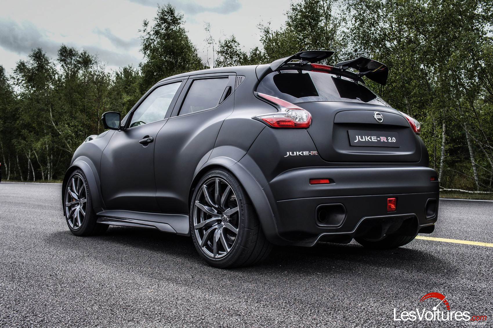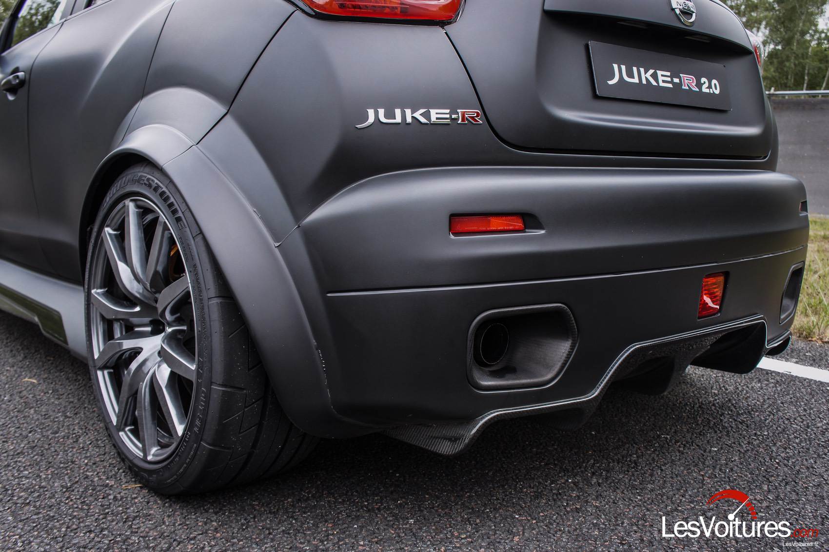 Esthétiquement, le Juke-R 2.0 a conservé la robe noire mat de son prédécesseur. Pour le reste, nous sommes en présence d’un crossover super-héros comme lorsque Bruce Banner s’énerve. Le Juke-R 2.0 reprend le look du dernier facelift du crossover avec de multiples évolutions : boucliers avant et arrière surdimensionnés en carbone et aux entrées d’air béantes. On retrouve de la fibre de carbone partout, pour les passages de roues, les bas de caisse, le capot aux deux entrées entrées d’air NACA, le diffuseur arrière, les carters des sorties d’échappement et le double aileron arrière réglable. Quant aux jantes de 20″, ce sont, bien sûr, celles de la GT-R NISMO 2015.