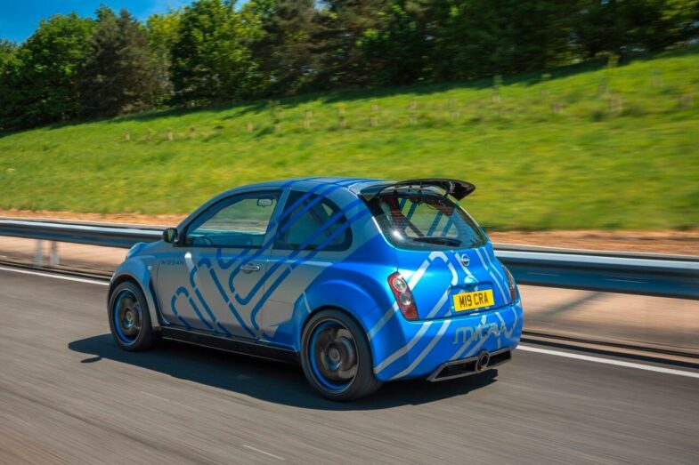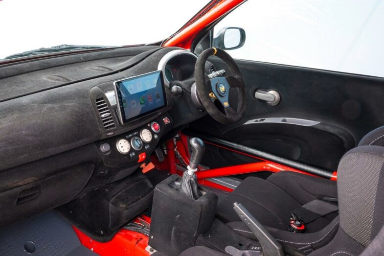 Grâce, aussi, à une reprogrammation, la puissance est alors passée de 265 à environ 300 ch envoyés aux roues arrière via une boîte manuelle. Avec un poids limité à 1 200 kg, cette petite « bombinette » pouvait atteindre les 96 km/h en moins de 5,0 s et dépasser les 240 km/h. Contrairement à la future Micra 100% électrique, la 350SR version 2025 conserve son moteur thermique, tel un restomod pour, essentiellement, sa carrosserie et son habitacle. Ci-dessous en photo, la Micra 350SR version dite « originelle » de 2005.
