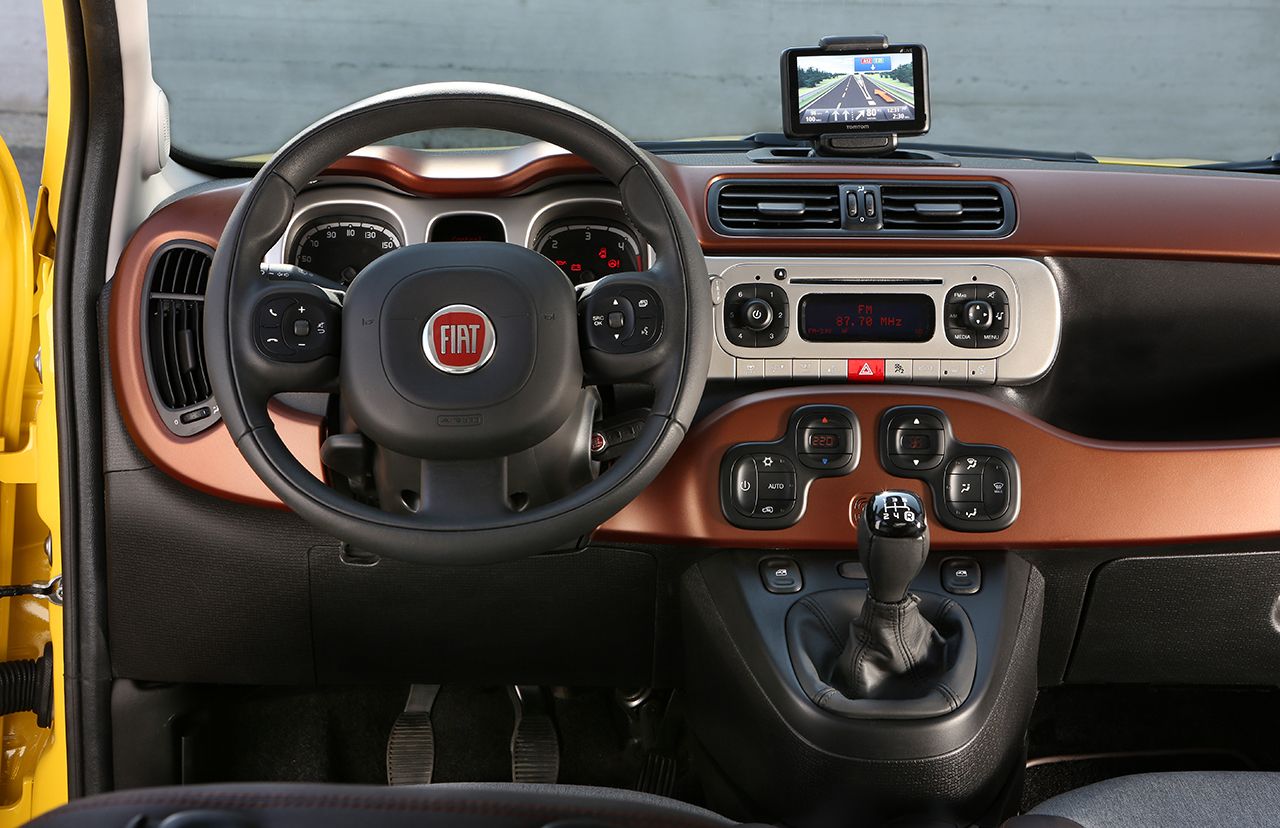 A l’intérieur, la Panda Cross 5 portes se caractérise par un habitacle raffiné d’une grande personnalité. Les sièges ont un tissu naturel technique avec des bandes cuivrées latérales en simili cuir pour correspondre à la garniture des panneaux de porte. Les sièges avant sont caractérisés par l’inscription Cross sur le dossier obtenue avec un insert en polyuréthane. La planche de bord se présente dans une nouvelle couleur cuivre pour s’harmoniser avec la nouvelle finition ‘silver ultrashine’ du tableau de bord. La même finition est utilisée pour la console centrale sur laquelle le nouveau système « Terrain Control » est installé. L’équipement est dominé par le volant aux commandes intégrées et le pommeau de levier de vitesses en cuir.