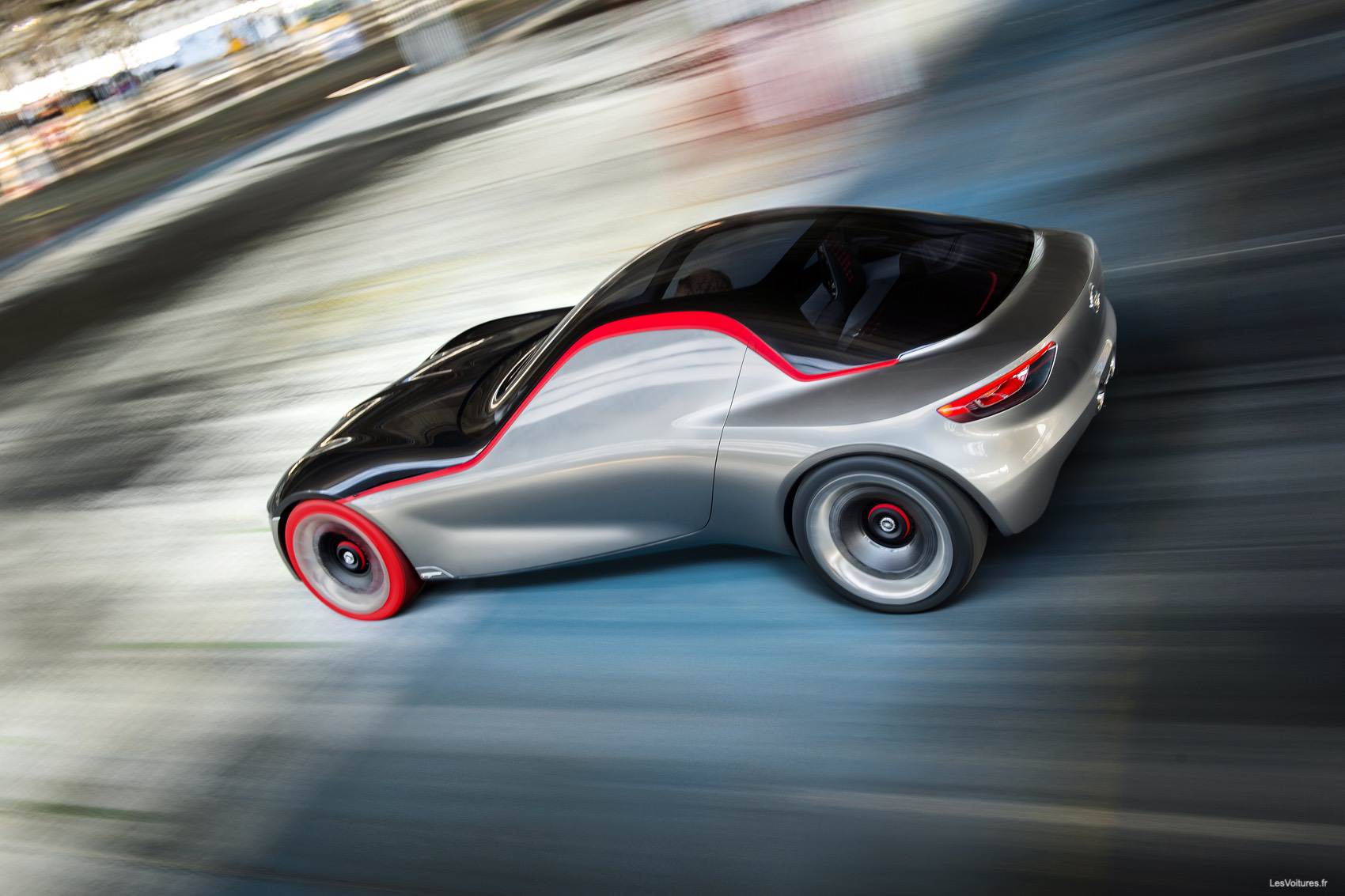 La ligne générale, encore bien éloignée de la série, ne se prive pas de donner du tempérament à ce concept qui reprend quelques éléments majeurs de la réussite d’Opel. Commençons par ces pneus rouges atypiques qui découlent de l’Opel Motoclub 500 de 1928. Une sacrée identité qui place le coupé parmi les éléments historiques de la firme. Dans un second temps, notons l’inévitable sortie d’échappement centrale qui fait un sacré clin d’oeil à l’Experimental GT de 1965. À ces références classiques, ajoutons la ligne horizontale des phares qui n’est pas sans rappeler la face avant de l’Opel Asconna 400 surmontée de son capot plongeant.