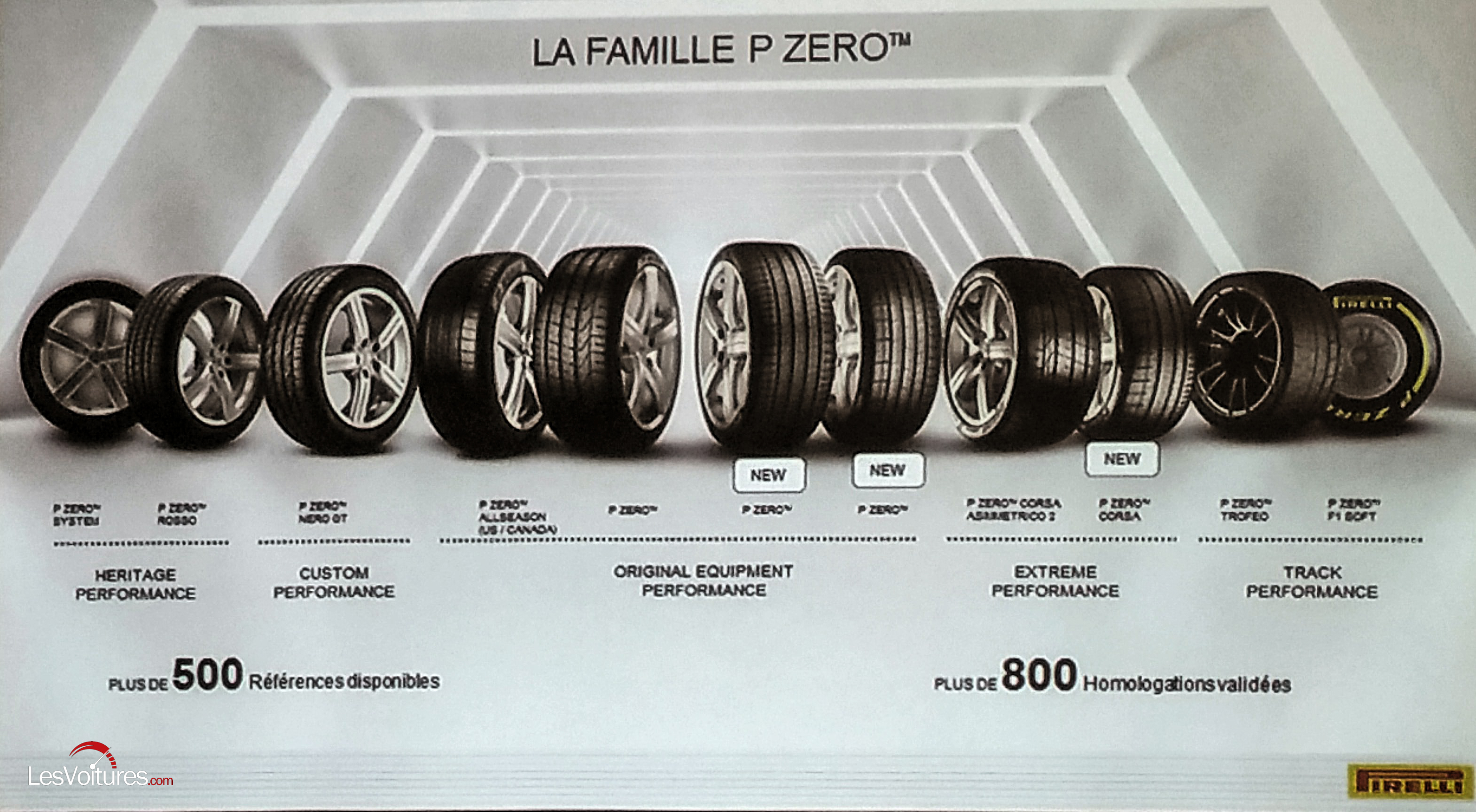 – Le P Zero Corsa pour les super sportives de type Pagani ou McLaren P1 où les notions mêmes de sportivité sont exacerbées avec un gros travail sur le grip, la vitesse, la vitesse en courbe et la tenue latérale.