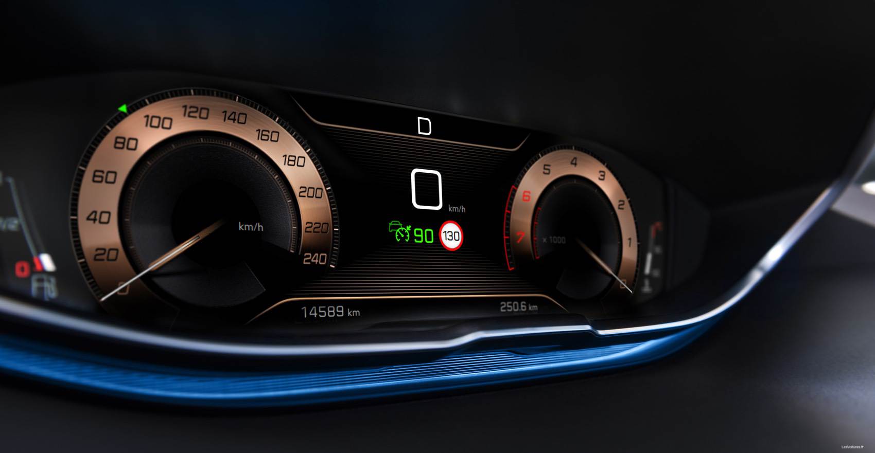 Les sièges bénéficient du même traitement et des éléments en « bois vieilli » de très bon goût ornent l’habitacle. A noter un détail intéressant, le combiné d’instrumentation digital profite aussi d’une couleur cuivrée spécifique. De l’inox, situé sur le pédalier les seuils de portes, est aussi d’actualité. Sans oublier la présence du Driver Sport Pack.