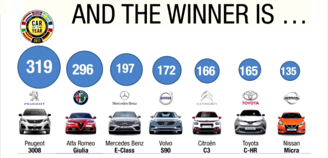 Succès mérité pour le SUV Peugeot 3008 qui rencontre depuis son lancement un très fort engouement commercial (100 000 commandes en Europe). Avec 319 points la deuxième génération du 3008 devance l’Alfa Romeo Giulia.