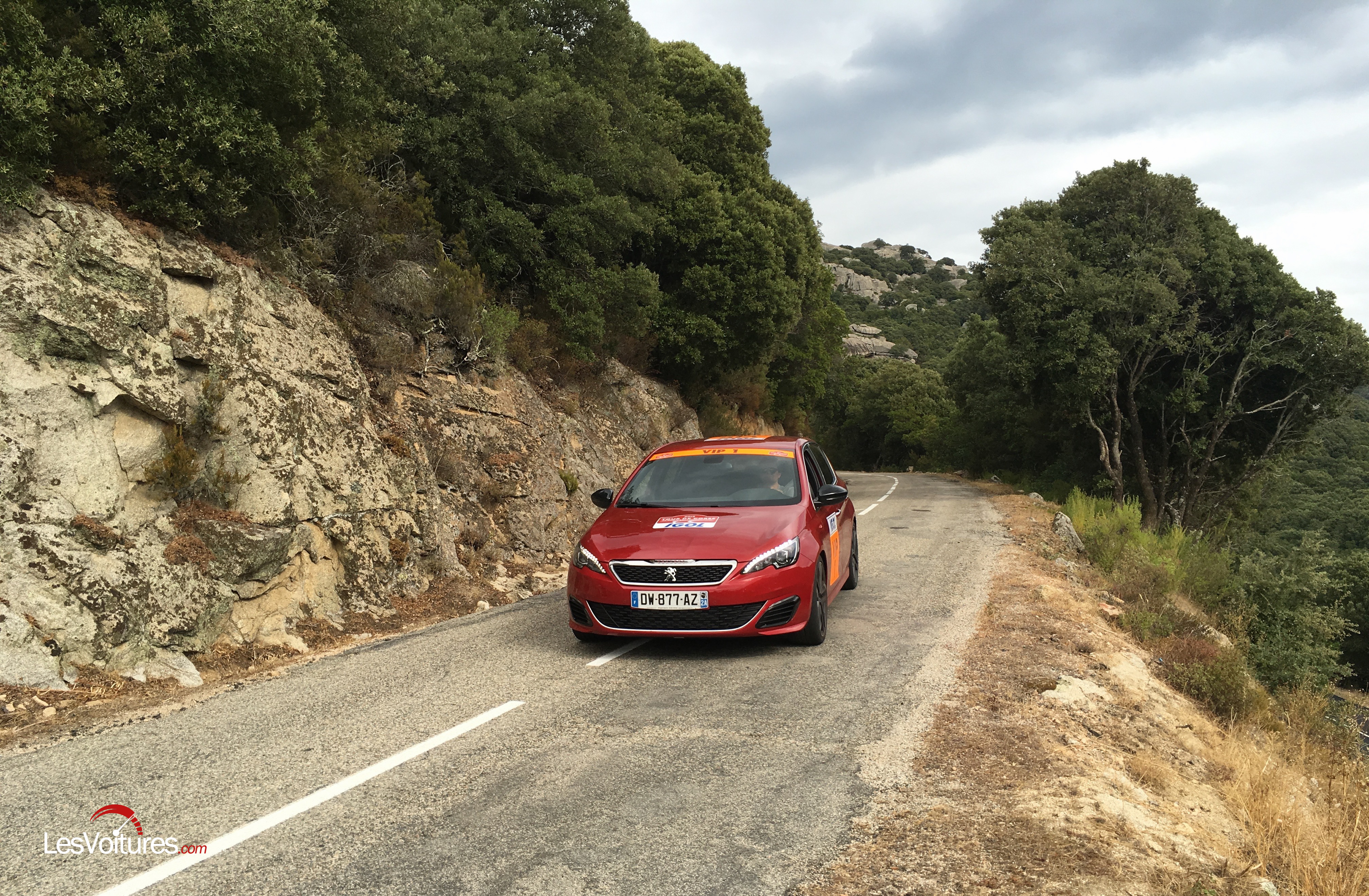 Lors de nos deux derniers sujets sur la présence de la lionne sportive en Corse, nous avons employé le terme « aventures » et ce mot a pris tout son sens aujourd’hui. Au volant de la 308 motorisée par le 1.6 l THP de 270 ch, notre pilote essayeur, Laurent Pasquali, a ouvert la première Spéciale du jour sans trop d’eau sur le pare-brise. Suivant les notes de son copilote Thomas K. de Chessé, les 29,12 km de cette épreuve chronométrée (pour les voitures du WRC) ont été parcourus sous une pluie légère, du départ de la plage du Liamone, à l’arrivée à Sarrola-Carcopino. Des portions très étroites aux revêtements détrempés et des virages rapides ont composé cette ES1 dont le point culminant était situé à Casaglione, avant la descente plus rapide jusqu’à Sarrola.
