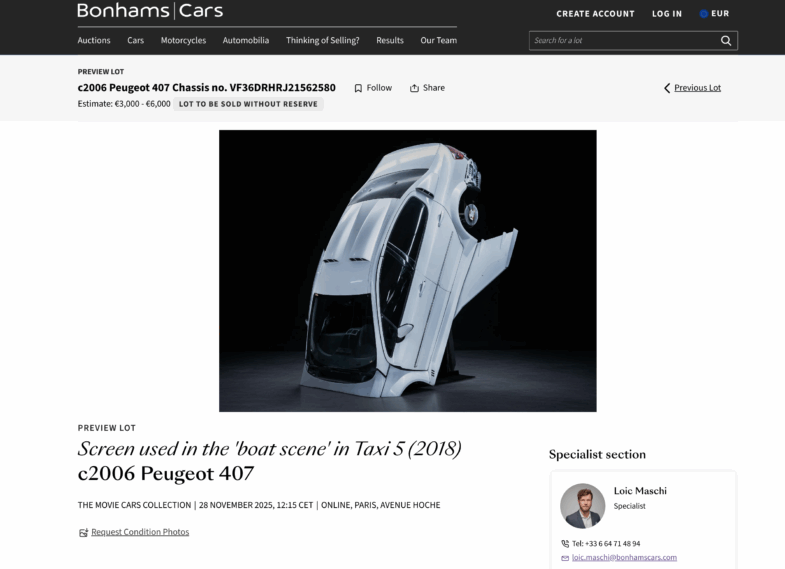 La Peugeot 407 de Taxi 5, celle qui a fini plantée dans un bateau (oui, une maquette, rassurez-vous), sera mise en vente aux enchères dans le cadre de l’événement « The Movie Cars Collection » de Bonhams. La maison de ventes aux enchères vient en effet de dévoiler d’autres modèles phares du catalogue de cette vente qui sera organisée du 21 au 28 novembre, en ligne, de Paris. Cette 407 rejoint ainsi la 406 de Taxi 2.
