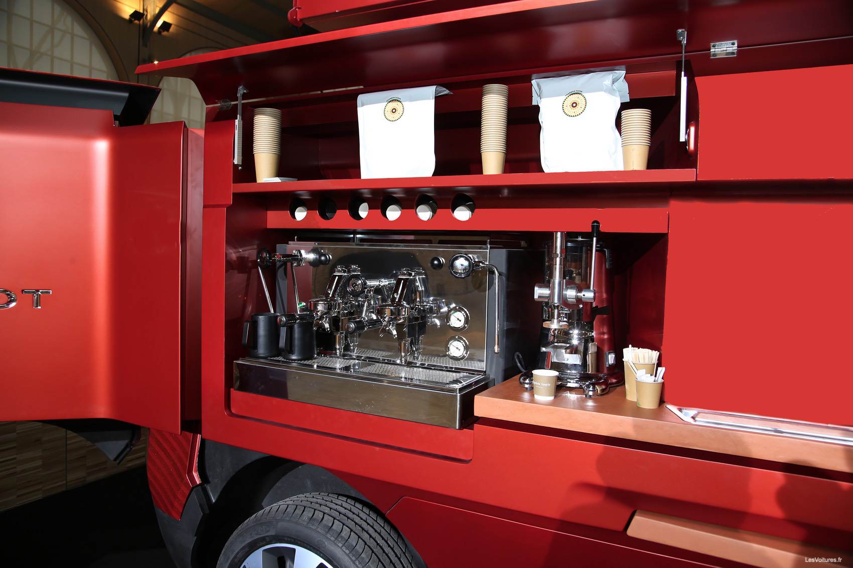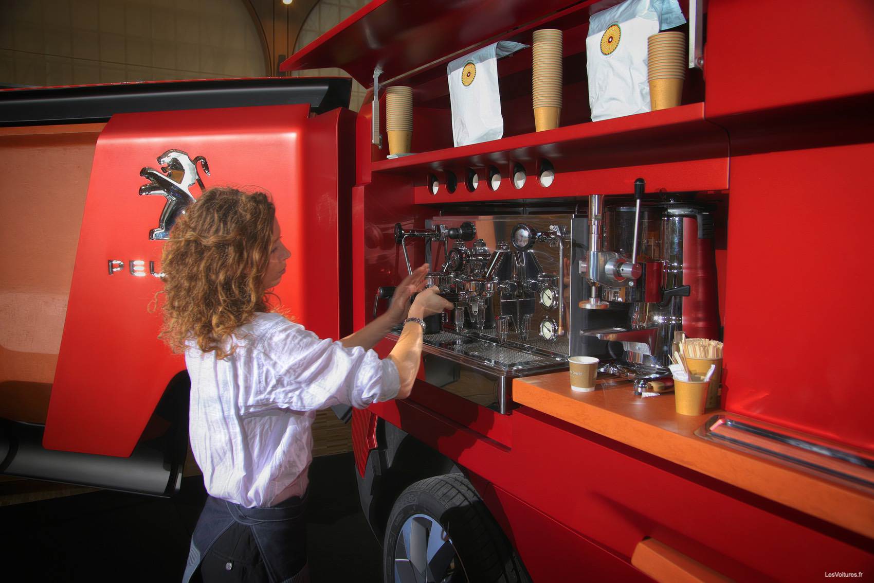 Conçu par par le Peugeot Design Lab, le food truck Peugeot a été présenté ce soir au Carreau du Temple à Paris. Le concept est aussi simple qu’efficace : proposer le meilleur du goût avec tout ce qu’il faut pour un verre, une pause déjeuner ou un dîner haut de gamme. Ainsi, la cuisine prend place dans la camion alors que la remorque intègre une machine à café dernier cri et une table de mixage ! Sans oublier de grosses enceintes.