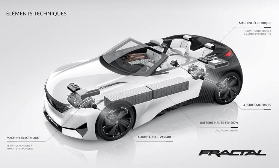 Le Fractal est un coupé-cabriolet 4 places dont la coupe franche est reprise des 208 GTi et 308 GTi by Peugeot Sport. Ces dimensions sont de 3,81 m de long et 1,77 m de large. Un blanc mat et du noir habillent le concept dont le pavillon n’est pas sans rappeler celui du Quartz. Une fois le toit enlevé, le coupé se transforme en cabriolet. Les optiques avant ont été particulièrement travaillées avec une ligne de diodes qui orne l’avant du Fractal, du bouclier aux ailes en traversant des feux triangulaires.