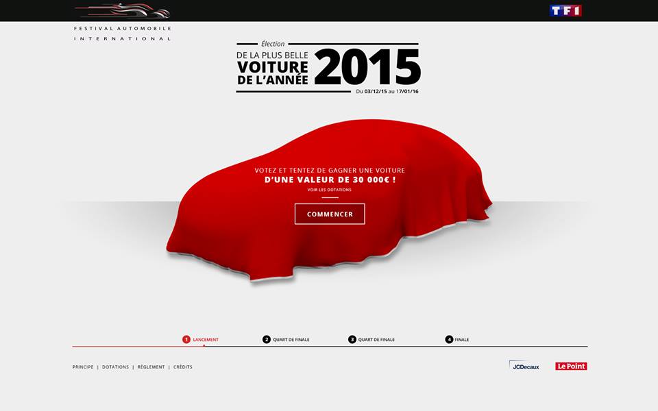 A partir du 3 décembre 2015, les votes seront ouverts puis le 1/4 de finale se déroulera du 14 au 23 décembre. La 1/2 finale suivra du 24 au 3 janvier 2016. Le titre de « la plus belle voiture de l’année 2015 » se jouera entre les deux finalistes du 4 au 17 janvier 2016. La voiture gagnante sera connue le 26 janvier lors de la Cérémonie Inaugurale et de remise des Grands Prix. Pour participer à partir du 3 décembre, cliquez ici. En 2014, c’est la Jaguar XE qui a été titrée.