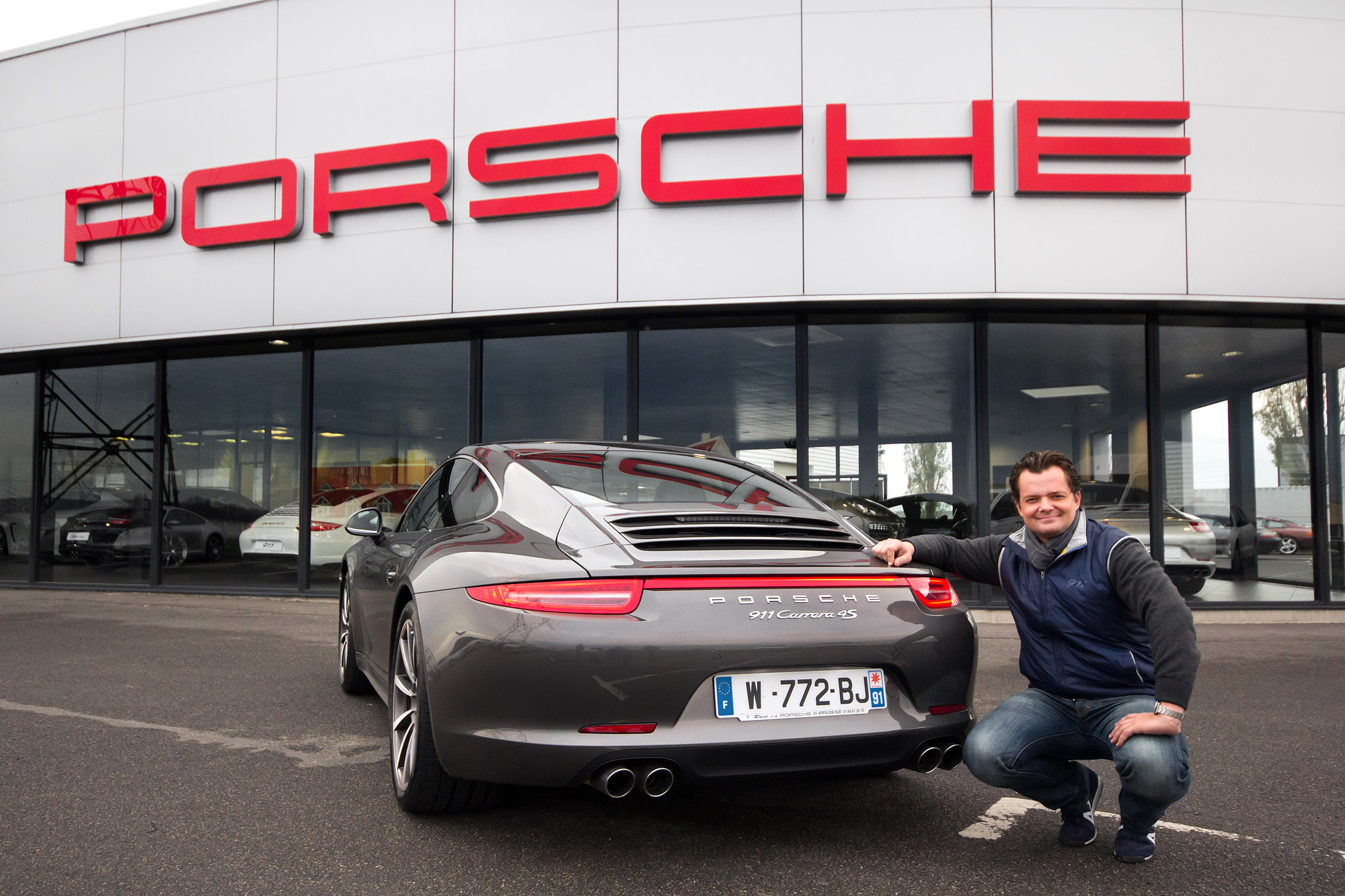 Laurent Pasquali nous accueille au Centre Porsche d’Arpajon (Groupe Ravé), partenaire fidèle de ses exploits en compétition. Il découvre avec nous la nouvelle Porsche 911 Carrera 4S (type 991) qui a été dévoilée en première mondiale lors du Mondial de l’Automobile de Paris il y a à peine 2 mois. Au premier coup d’œil il nous fait remarquer les modifications extérieures : « Le bouclier avant intègre maintenant des ailettes par rapport à la S. L’arrière de l’auto est visuellement plus massif car la 4S est plus large de 44 millimètres. » Les pilotes sont toujours précis, cela se joue souvent au millimètre en course…