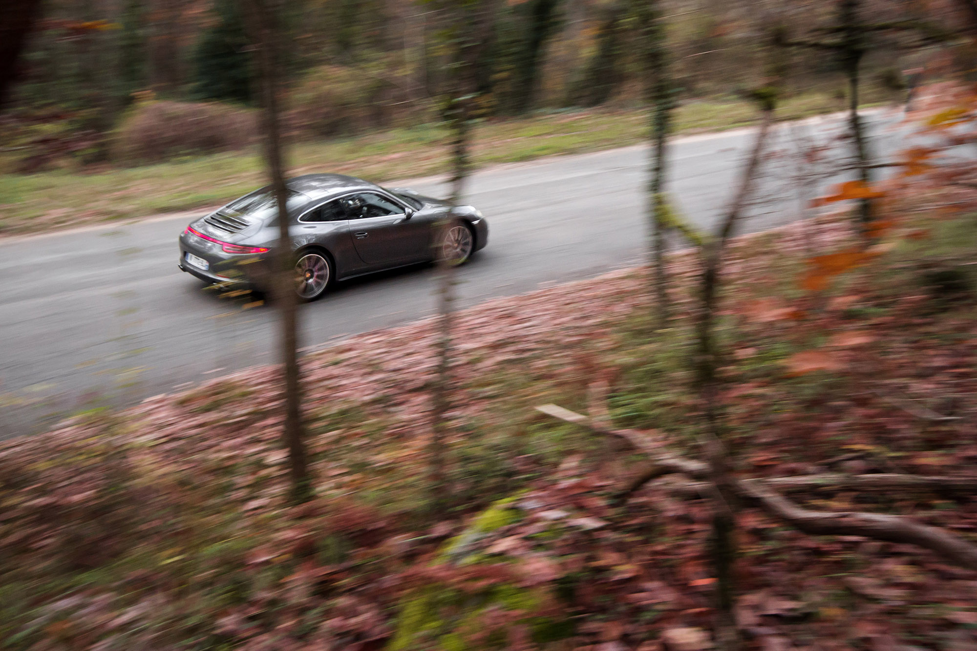 Nous laissons Laurent seul au volant sur une route plongée dans une ambiance automnale afin que notre photographe Alexandre Besançon puisse capter le dynamisme de l’auto. Ce type de route est le terrain de jeux idéal pour notre 4S et rien ne peut la déstabiliser même avec un pilote à ses commandes. Ce coupé 2+2 est en effet « hyper intelligent ». Son cerveau est doté de multiples technologies dont voici les principales. Le PTM (Porsche Traction Management) gère la répartition de la motricité entre les roues avant et arrière en fonction de la situation. En pratique l’auto devient très agile sur les petites routes tortueuses et quand les conditions d’adhérence se dégradent par temps de pluie ou à la montagne. Et pour visualiser les bénéfices du PTM, le conducteur dispose de l’affichage des données en temps réel sur un écran situé à droite du tableau de bord. Ce même écran peut aussi basculer en mode « G Forces » et indique alors le nombre de G subis. Le PTM optimise aussi la consommation de carburant et autorise le roulage en roue libre ! Les consommations de la 911 Carrera 4S (avec la boite PDK et le PTM) sont données pour 12,7 l/100 km en cycle urbain et 7,0 l/100 km en extra-urbain.