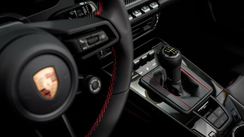 De série, l’habitacle est tendu de cuir noir, y compris les pare‑soleil et les montants de pare‑brise, avec un logo « GT3 S/C » brodé derrière les sièges et un volant en cuir perforé. Le combiné d’instrumentation numérique propose un mode « Track Screen » qui ne conserve que les données essentielles et affiche des témoins de passage de rapport. Pas de bouton « Start » ici, mais un contacteur à gauche du volant, fidèle à la tradition Porsche. Le système « PCM (Porsche Communication Management) » affiche la voiture en modèle 3D dans sa vraie couleur. À noter que la commande vocale profite désormais d’une assistance par IA, et une application « Themes » permet de modifier les fonds d’écran pour adapter l’ambiance visuelle à ses préférences.