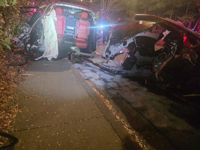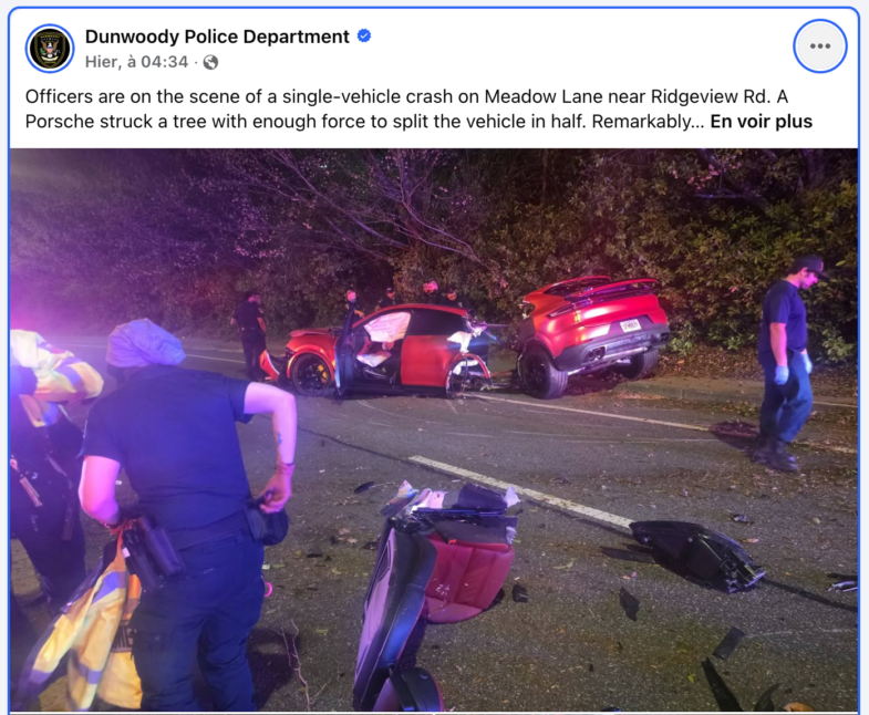 La scène est aussi spectaculaire qu’inquiétante. Selon la police de Dunwoody (en Géorgie), les agents sont intervenus, dans la nuit du 31 mars au 1er avril, sur Meadow Lane près de Ridgeview Road après un accident impliquant un seul véhicule. Les photos diffusées par les autorités montrent un Porsche Cayenne Coupé littéralement coupé en deux sections reliées par quelques faisceaux électriques et éléments de structure, la partie arrière reposant plusieurs mètres derrière l’avant. Le siège passager a été arraché et gît sur la chaussée. Les photos publiées sur la page Facebook Dunwoody Police Department font froid dans le dos, mais elles prouvent aussi que les constructeurs automobiles mettent tous les moyens pour rendre leurs modèles les plus sûrs possible. En 2018 en Italie, c’est une Audi R8 qui a également été coupée en deux suite à un choc très violent. C’est à découvrir ou redécouvrir en cliquant sur : Audi R8 Coupé coupée en deux.