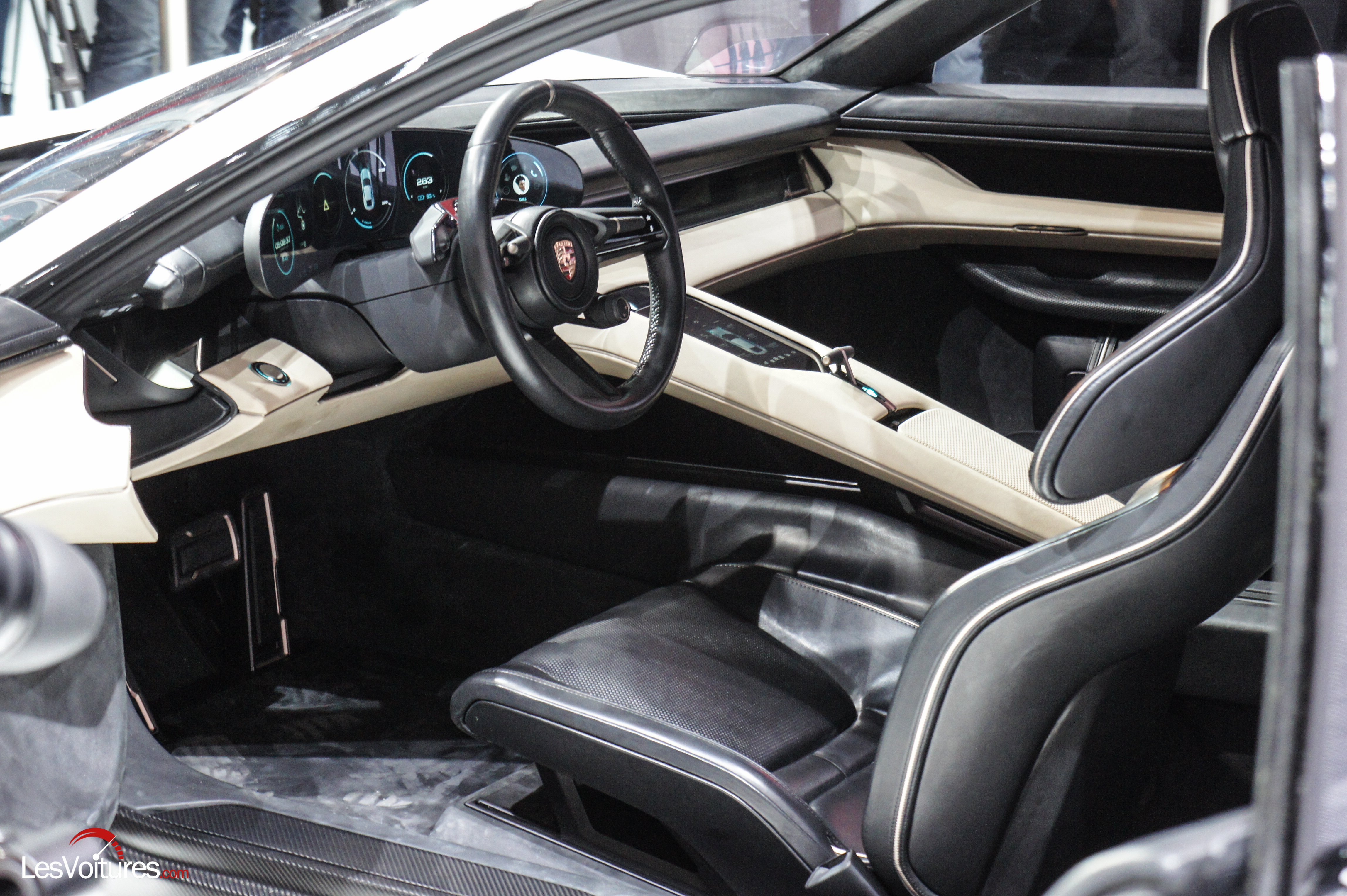L’intérieur a été traité avec autant de soin. Les plastiques de bonne facture se mêlent à l’aluminium et au carbone pour constituer un intérieur sobre à la finition irréprochable, à la Porsche finalement. Les tableaux de bord sont complètement virtuels grâce à des écrans à LEDs, et s’inclinent automatiquement en fonction de la position des passagers. Un système détectant les mouvements de l’œil et la focalisation sur un point particulier permet de naviguer dans les fonctionnalités.