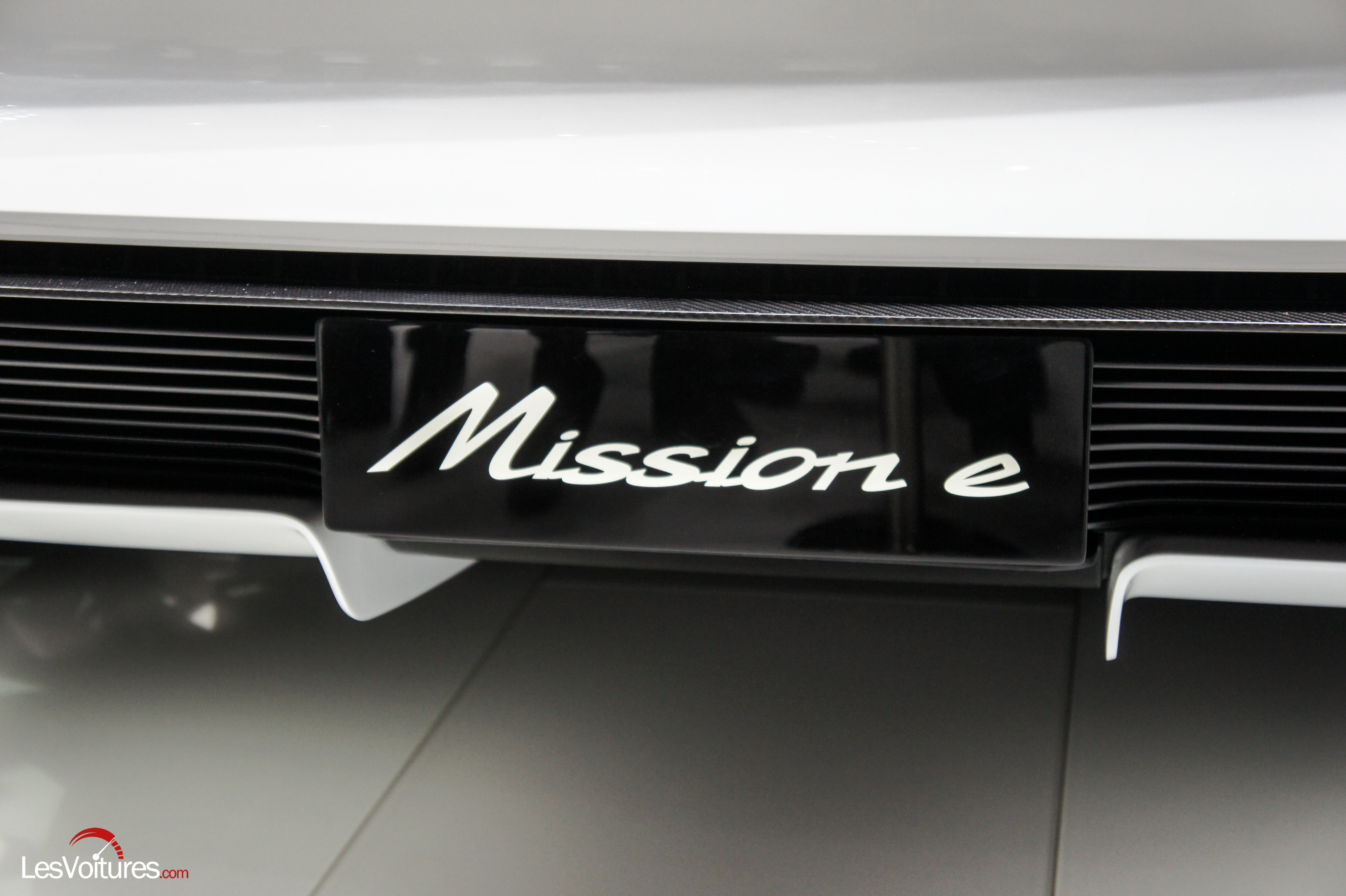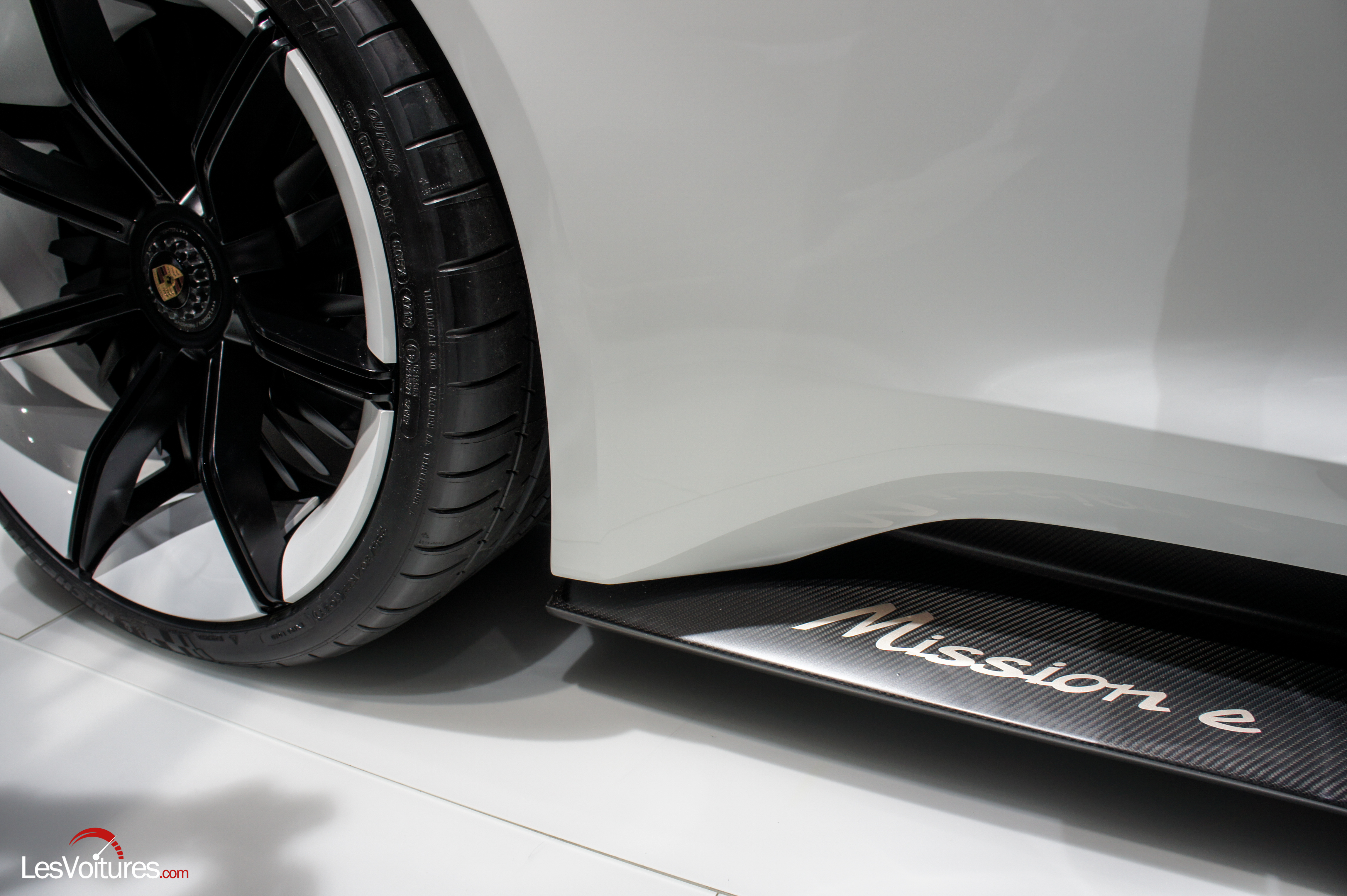 Les lignes du Concept Mission E sont fluides et élancées. Le Cx (coefficient aérodynamique) du véhicule n’a pas été dévoilé, mais il y a fort à parier que les ingénieurs de Porsche ont fait fort. Une lame noire fait le tour du véhicule à robe blanche, soulignant boucliers avant, bas de caisse et bouclier arrière. Les feux avant à quatre projecteurs sont bordés d’ouïes aérodynamiques, ce qui confère un regard très acéré au visage du concept. A l’arrière de l’auto, le toit plongeant se termine dans une ligne de feux arrière rappelant quelque peu la 964, dont les optiques droite et gauche se rejoignaient. Un extracteur arrière démesuré vient finir de souligner le sang racé du concept.