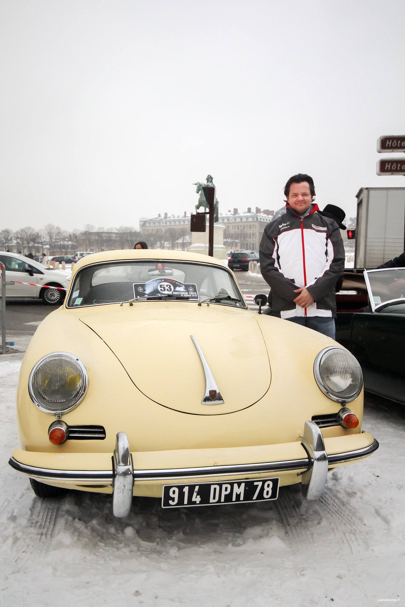 Le froid glacial persistait toujours et même si les routes de Versailles étaient dégagées, les organisateurs décidèrent de modifier le parcours « aller ». En effet, les routes qui allaient être empruntées dans la Vallée de Chevreuse, pour atteindre le château de Dampierre, représentaient un risque trop important en cas d’enneigement. Le road book fut donc mis de côté et les départs ont été organisés par convois. Sage décision prise par le YOTC, preuve de la maturité et du sérieux des jeunes organisateurs. A noter qu’un visiteur surprise, Laurent Pasquali, champion de France GT 2011 à fait une apparition remarquée juste avant le départ. « Porschiste » de naissance, il ne pouvait prendre la pause qu’à côté d’une magnifique 356 B de 1960.
