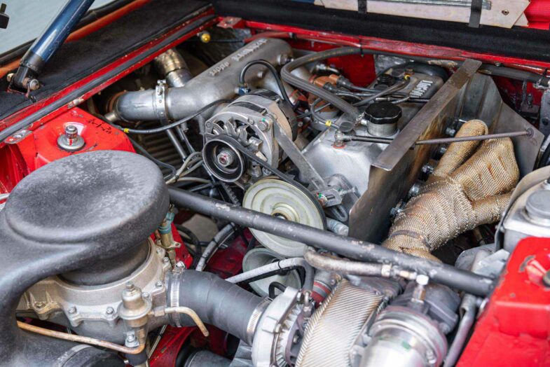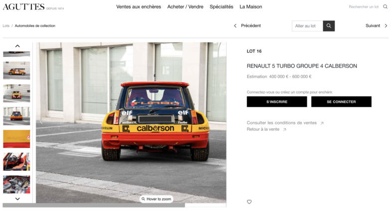 La mécanique de cette Renault 5 Turbo Groupe 4 recèle des spécificités remarquables, héritées directement du programme compétition : échangeur air/eau Chausson, turbocompresseur spécifique sans wastegate intégrée, collecteur d’échappement dédié, carter sec avec bâche à huile, boîte à rapports rapprochés avec autobloquant ZF à 40 %, pédalier avec maîtres-cylindres doubles comme sur les monoplaces, et ce gros plateau-sonde issu de la Porsche 928. Cette architecture qui préfigure directement la version Tour de Corse de 1983, développant environ 260 ch et qui évoluera jusqu’aux 350 ch sur la Maxi. Pour tout savoir sur cette R5 Turbo, nous vous invitons à cliquer sur l’image située ci-dessous pour accéder au site web Aguttes.