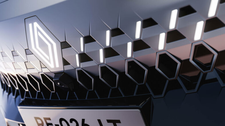 Dans le détail de la face avant du Renault Filante, elle se distingue par des optiques inspirées de celles de la nouvelle Clio, volontairement compactes au regard du gabarit. Le capot horizontal contraste avec un bouclier vertical orné de barrettes lumineuses rejoignant le logo central éclairé. Les feux de jour sont positionnés plus bas, aux extrémités du pare-chocs et de la prise d’air décorée de multiples losanges.
