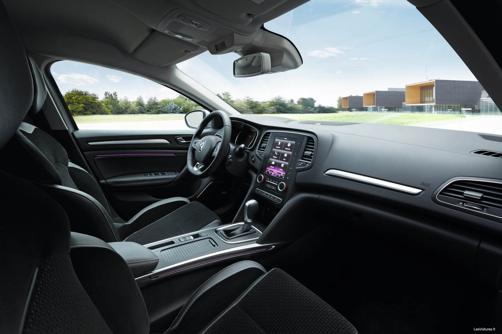 L’intérieur de la Mégane gagne en espace avec 20 mm de plus pour les genoux et c’est tout l’espace de vie qui profite d’un volume plus important (coffre de 434 l ). Le poste de conduite fait apparaître des instrumentations au style cockpit. La tablette tactile R-Link 2 de 8,7″ est au programme et le volant est en cuir nappa pleine fleur. Ceci pour les modèles du haut de la gamme. Les sièges chauffants et massants sont aussi de série pour les versions les plus équipées. Cinq ambiances lumineuses sont proposées pour l’habitacle : vert, bleu, violet, rouge et brun.