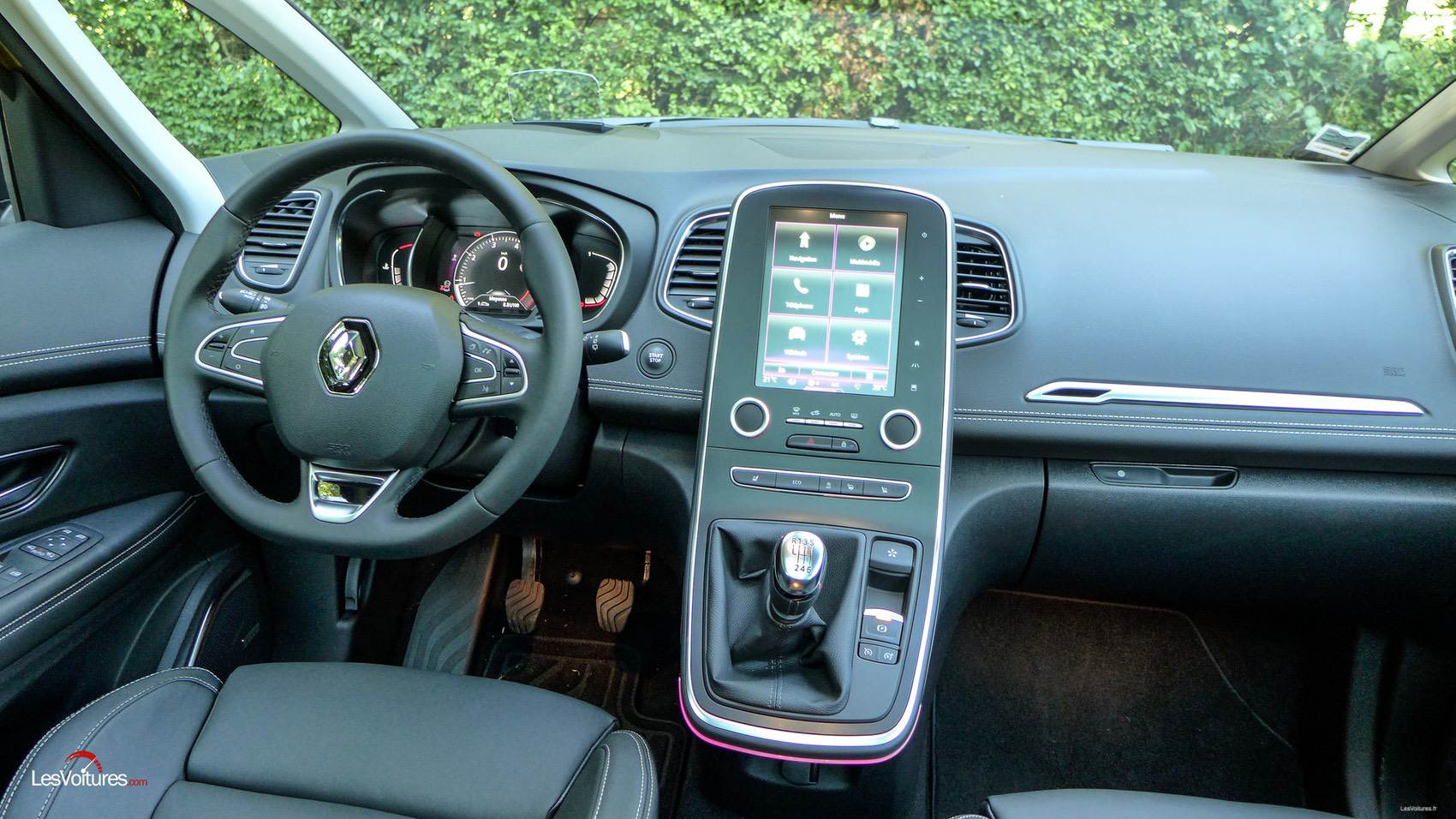 Grâce à sa ligne de monospace, le regard se projette loin, très loin. Le pare-brise d’une taille géante offre une visibilité de très haut niveau. Ajoutez à cela le toit vitré panoramique (option), une finition et des éléments de très bonne qualité et vous obtiendrez un espace de vie qui ravira les familles. Précisons que le toit panoramique ne s’ouvre pas. Rajoutons au chapitre des points faibles, l’habitabilité arrière est un peu décevante et des rangements trop petits. Sur le plan du volume de chargement, celui-ci est de 506 l, de quoi satisfaire les plus exigeants. Autre point fort, les sièges arrière se rabattent automatiquement en une simple pression sur un bouton. Ce système baptisé One Touch est présent de série sur notre Scénic haut de gamme Intens.