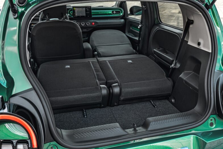 Le volume du coffre de la Renault Twingo E-Tech électrique varie de 205 à 305 l, jusqu’à 966 l sièges rabattus, tandis que le siège passager avant bascule pour accueillir des objets de 2 m. Un rangement de 50 l sous le plancher permet de stocker le câble de recharge. Plusieurs accessoires colorés sont proposés, même si les plastiques durs restent omniprésents.
