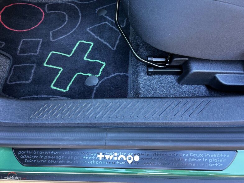 Plusieurs clins d’œil rappellent l’ADN Twingo, comme le slogan « À vous d’inventer la vie qui va avec » sur les sangles des sièges arrière ou le message « Ouvert d’esprit » à l’intérieur du hayon.