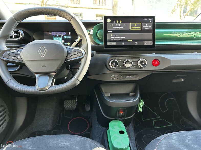 Le poste de conduite de la Renault Twingo E-Tech électrique reprend la modernité des R4 et R5 avec un double écran 7 + 10″, Android Automotive et Android Auto/Apple CarPlay sans fil dès la version « Evolution ».
