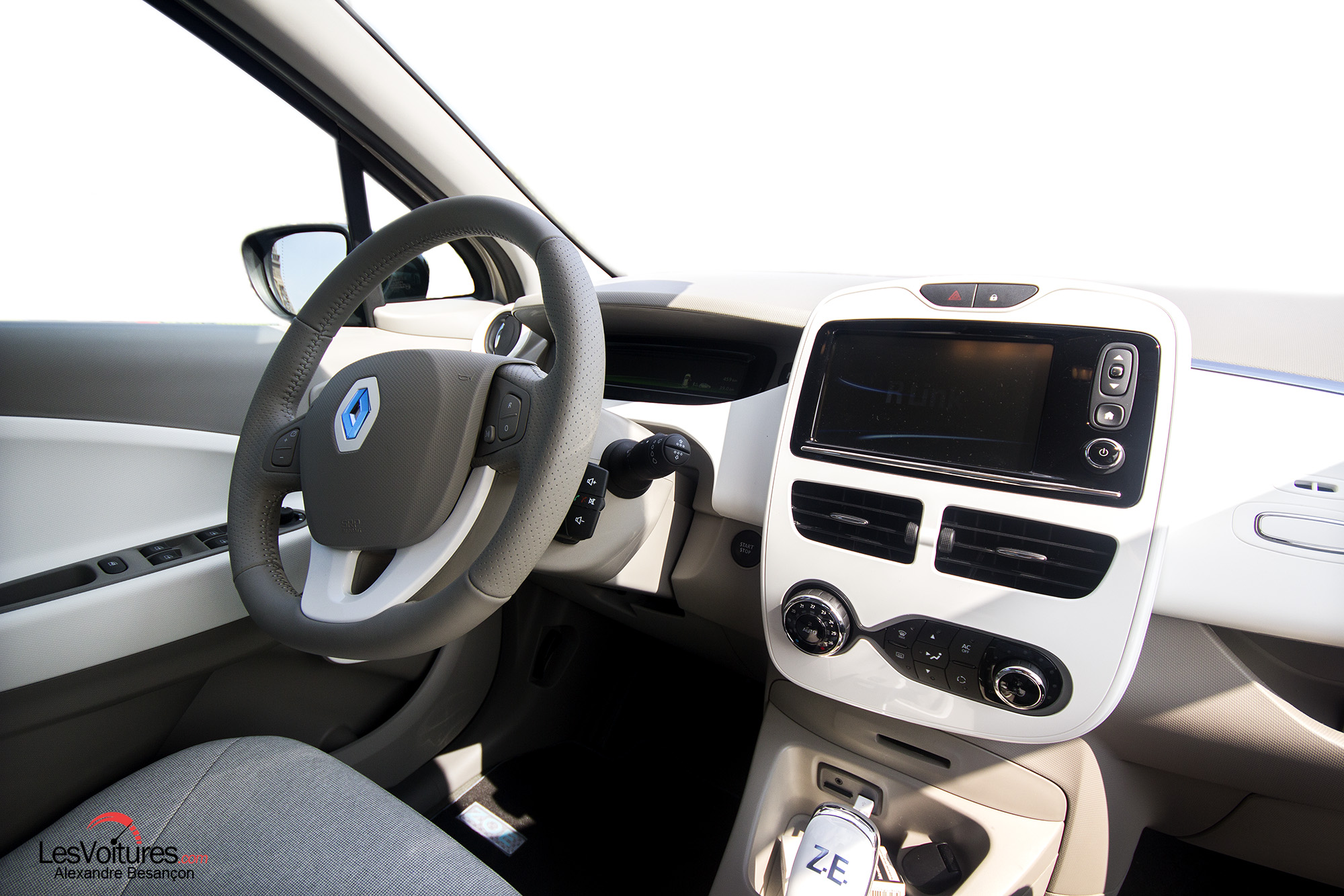 Si on passe outre ces détails techniques, la ZOE reste donc une auto agréable à vivre au quotidien. Son moteur électrique de 88 chevaux quasi-constants (2500 à 11000 tr/min) emmène la petite fée électrique en silence et sans trou dans l’accélération jusqu’à 135 km/h, une vitesse honorable pour une citadine. Le couple de 220 Nm est disponible instantanément (250 tr/min) et permet de devancer tout le monde au feu rouge. Question pratique, le coffre de la ZOE permettra beaucoup de choses : avec un volume de chargement de 338 litres, il outrepasse le coffre de la Clio de 38 litres. Enfin, l’autonomie officielle de la batterie est annoncée à 210 km. En pratique, il faut plutôt compter 100 à 150 km, ce qui permet tout de même quelques aller-retours de proximité.