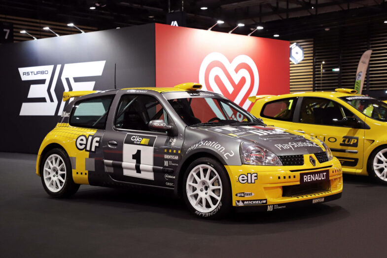 Le public retrouvera ensuite l’une des interprétations les plus extrêmes jamais produites : la Renault Clio V6 (2000). Issue d’un partenariat avec TWR, cette Clio II profondément remaniée embarque un V6 en position centrale‑arrière de 230 ch, héritière moderne de la Renault 5 Turbo et véritable ovni dans l’histoire de Renault Sport.