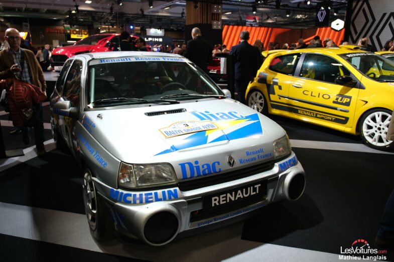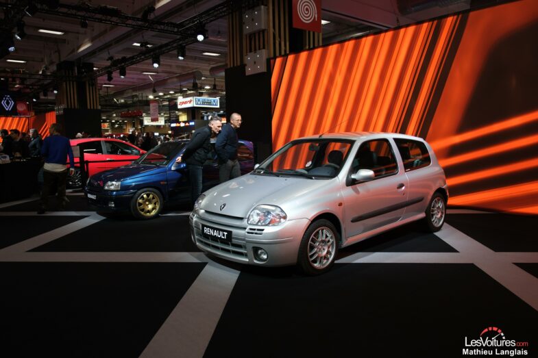 Le public découvre ensuite l’une des interprétations les plus extrêmes jamais produites : la Renault Clio V6 (2000). Issue d’un partenariat avec TWR, cette Clio II profondément remaniée embarque un V6 en position centrale‑arrière développant 230 ch, héritière moderne de la Renault 5 Turbo et véritable ovni dans l’histoire de Renault Sport. Sa présence sur le stand attire immédiatement les regards tant elle reste, encore aujourd’hui, l’une des créations les plus audacieuses du Losange.
